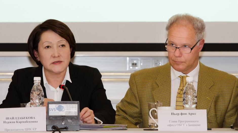 (l-r) Nurjan Shaildabekova, Chairperson of the Central Commission for Elections and Referenda of the Kyrgyz Republic, and Pierre von Arx, Head of the OSCE Programme Office in Bishkek, Bishkek, 11 May 2018.