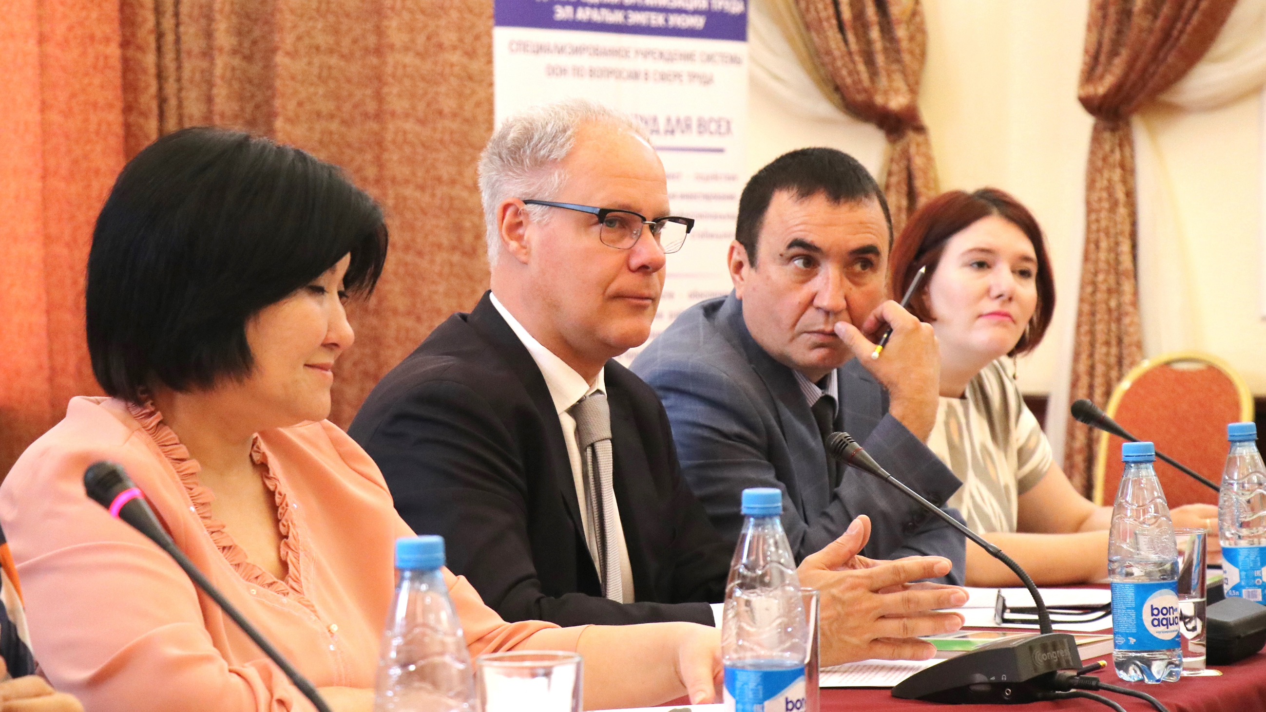 (L-r) Nadira Jusupbekova, Deputy Minister of Education and Science of the Kyrgyz Republic, Ambassador Pierre von Arx, Head of the OSCE Programme Office in Bishkek, Amir Ishmatov, Senior Programme Assistant and Ms. Eleni Galani, Consultant - listen to a speaker at a Conference dedicated to the "World Day Against Trafficking in Human Beings" in Kyrgyzstan, 30 July 2018.