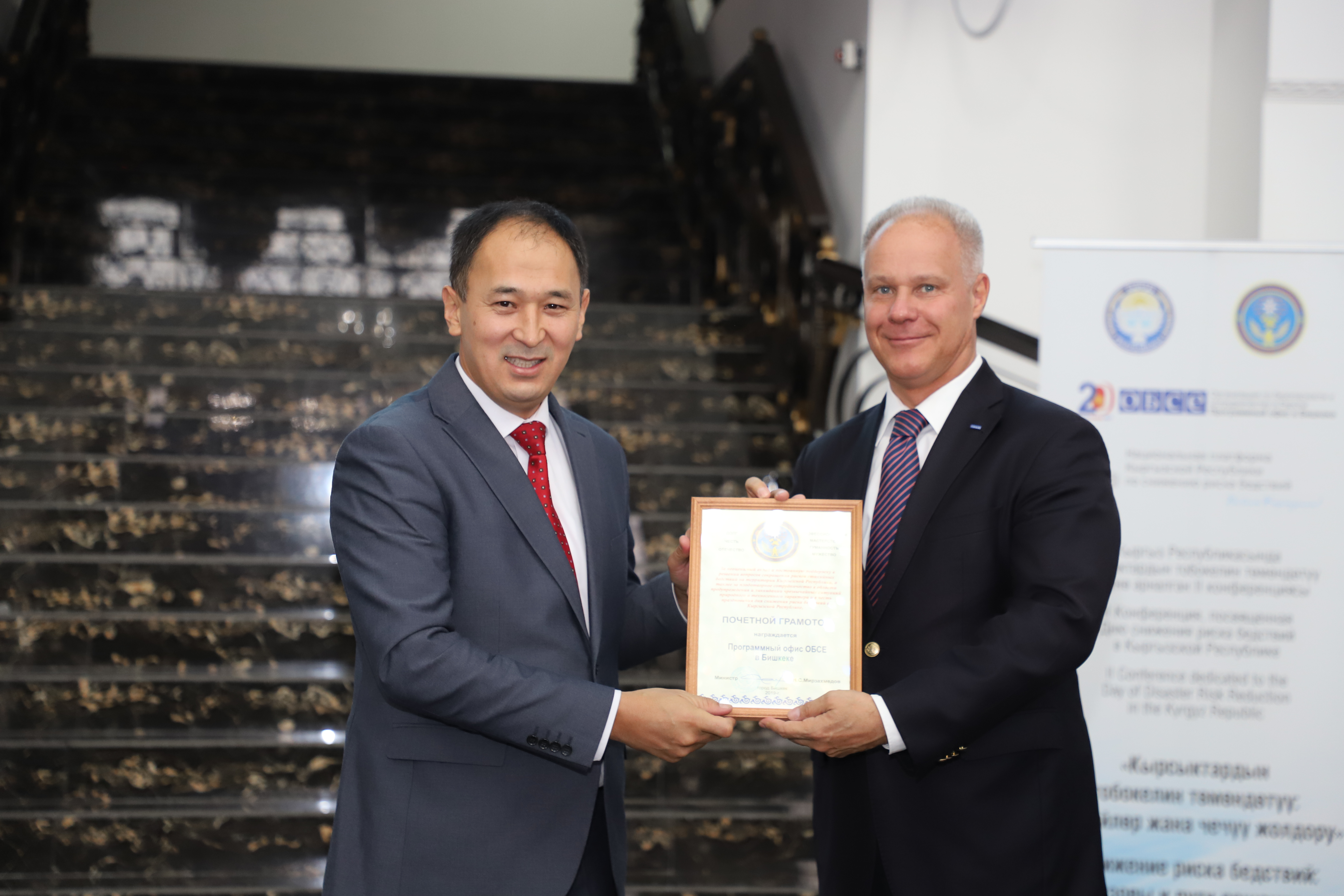 State Secretary of the Ministry of Emergency Situations of the Kyrgyz Republic, Azamat Mambetov, is awarding the Head of the OSCE Programme Office in Bishkek, Ambassador Pierre von Arx, for the invaluable contribution of the OSCE Programme Office in Bishkek to Disaster Risk Reduction in Kyrgyzstan, 4 October, 2019.