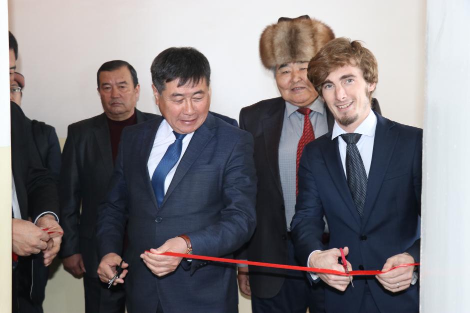 Edoardo da Ros, Regional development officer at the OSCE Programme Office in Bishkek and Akylbek Osmonaliev, Plenipotentiary representative of the Government of the Kyrgyz Republic in Issyk-Kul province, cut the ribbon to declare the 4th Entrepreneurship Support Centre in Kyrgyzstan open, Karakol, 12 November 2019.
