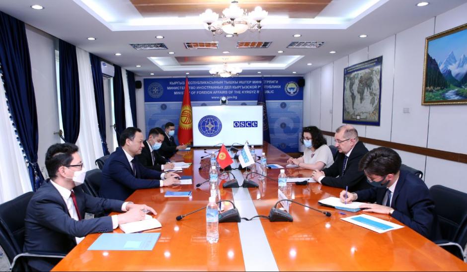 The Minister of Foreign Affairs of the Kyrgyz Republic, Ruslan Kazakbaev, meets with the recently appointed Head of the OSCE Programme Office in Bishkek, Alexey Rogov, Bishkek, 3 June 2021.