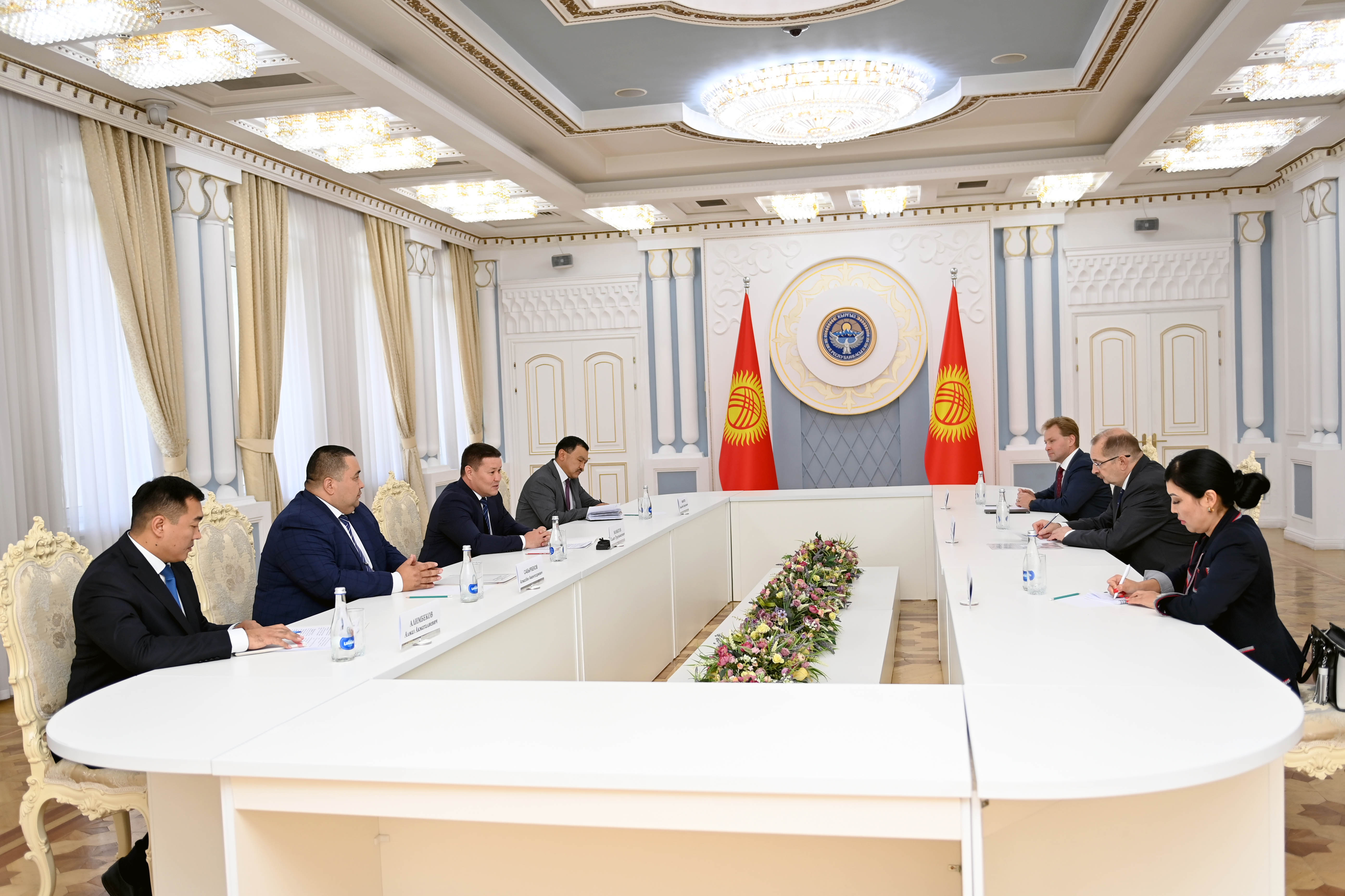 Meeting of the Head of the OSCE Programme Office in Bishkek, Alexey Rogov, with the Speaker of the Kyrgyz Parliament, Talant Mamytov, Bishkek, Kyrgyzstan, 16 September 2021. (Press Services of the National Parliament of the Kyrgyz Republic)