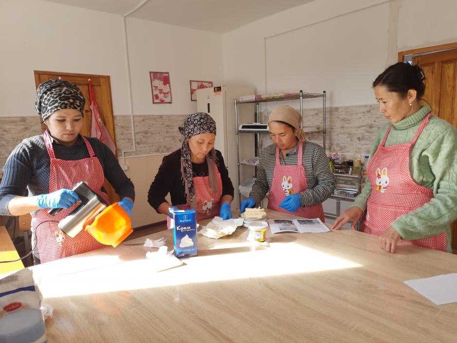Students learning baking techniques at Aida Batyrova’s class, Batken, Kyrgyzstan.