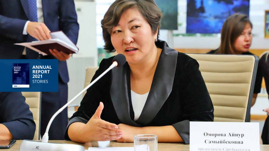 Ainura Omorova, Chairperson of the Saruu Village Council, discussing the 30 per cent quota at a press café organized by the Programme Office in Bishkek, November 2019.