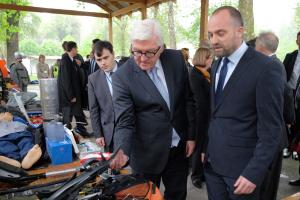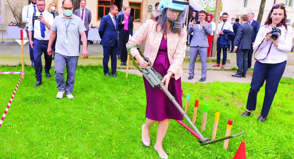 Ann Linde, OSCE Chairperson-in-Office and Swedish Minister for Foreign Affairs, trying a mine detector used for work in areas contaminated with mines and explosive remnants of war, Dushanbe, 15 April 2021. (OSCE/Farhod Nabiyulloev) Photo details