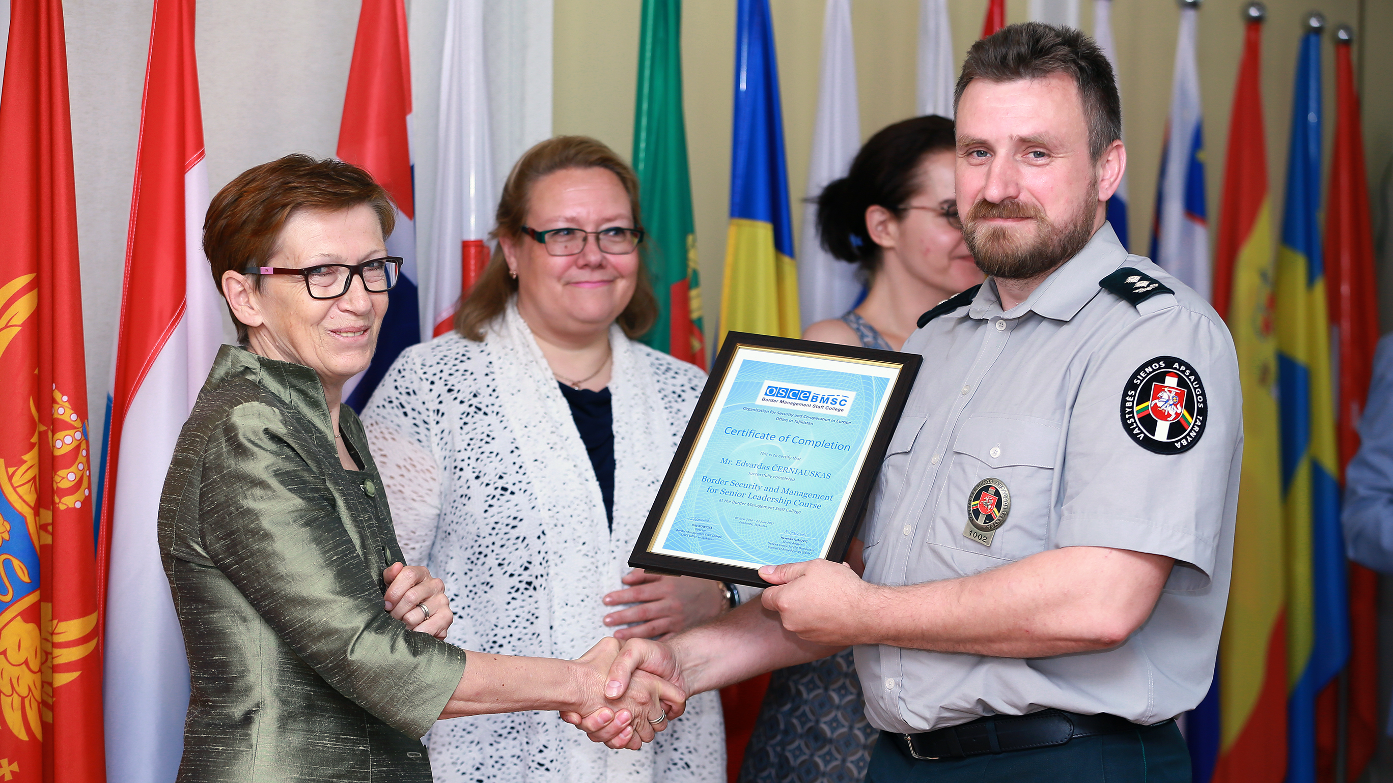 Edvardas Cerniauskas, Deputy Head Commander of the Vilnius Detachment of the Lithuanian State Border Guard Service, receiving a certificate for best coursework at the second Border Security and Management for Senior Leadership course, Dushanbe, 22 June 2017.