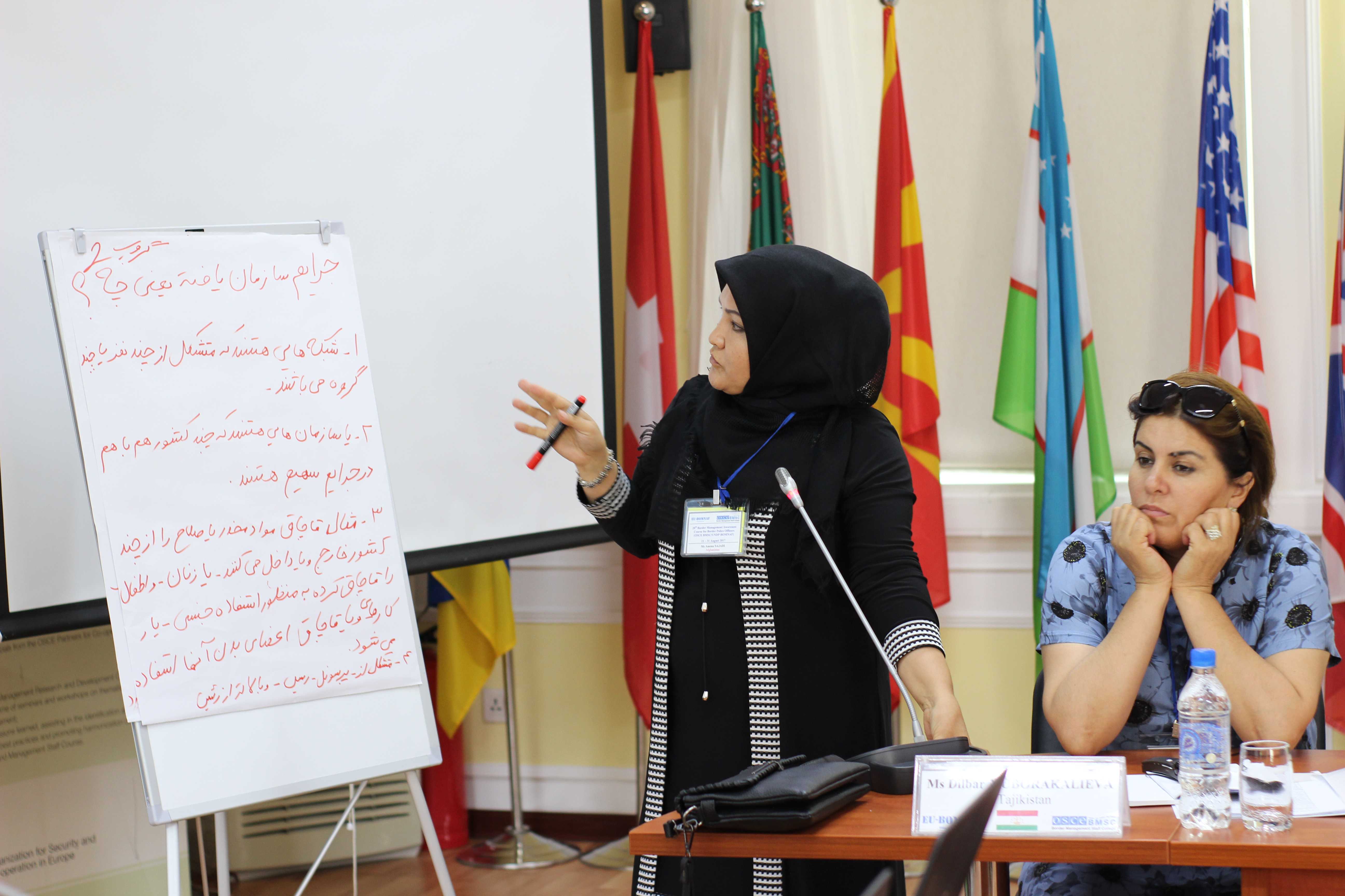 A participant from Afghanistan discusses cross border cooperation at the OSCE Border Management Staff College in Dushanbe, 28 August 2017.
