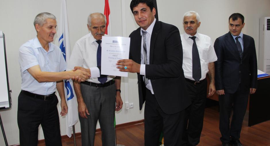 Twenty-one officers of the Tajik Border Troops and Afghan Border Police successfully completed a three-week training-of-trainers course on 6 September 2017 organized by the OSCE Programme Office in Dushanbe.