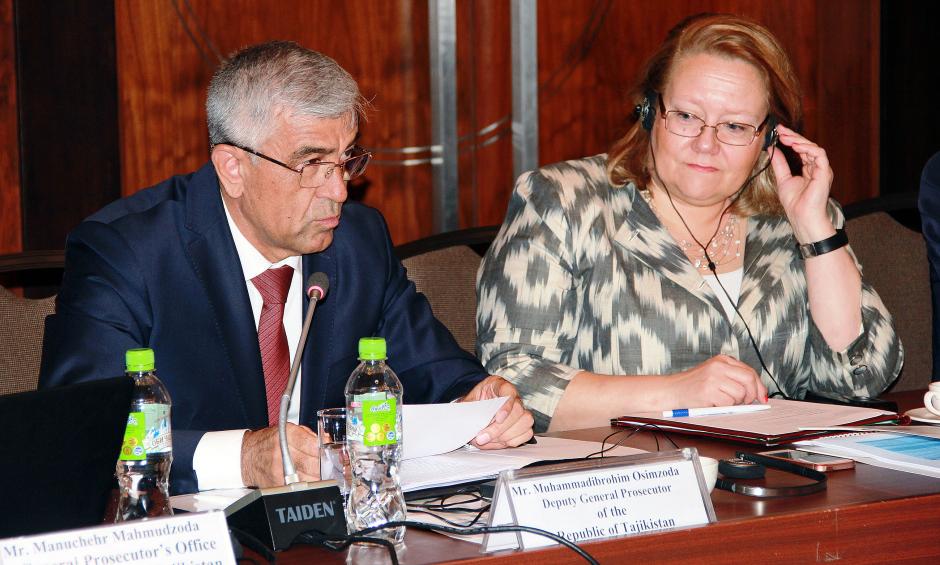 Muhammad-Ibrohim Osimzoda, Tajikistan’s Deputy General Prosecutor (l) and Ambassador Tuula Yrjölä, Head of the OSCE Programme Office in Dushanbe (r) during the opening speech at a roundtable discussion on Tajikistan’s National Strategy on preventing violent extremism, Dushanbe, 14 September 2017.