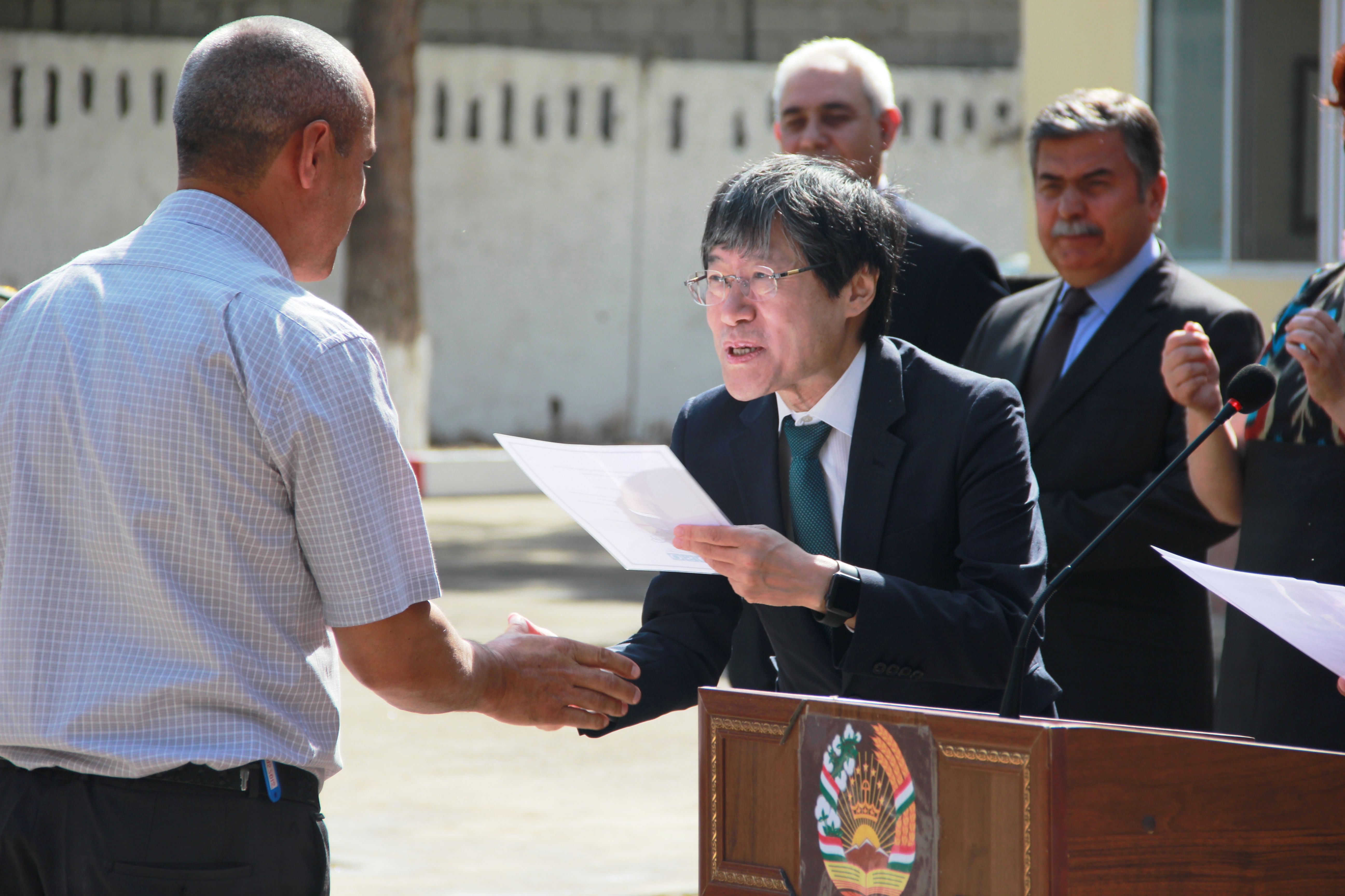 Japanese Ambassador in Tajikistan, Hajime Kitaoka hands over a certificate of recognition to one of the Patrol Programming and Leadership Project team members, Gissar Training Centre, 15 September 2017.