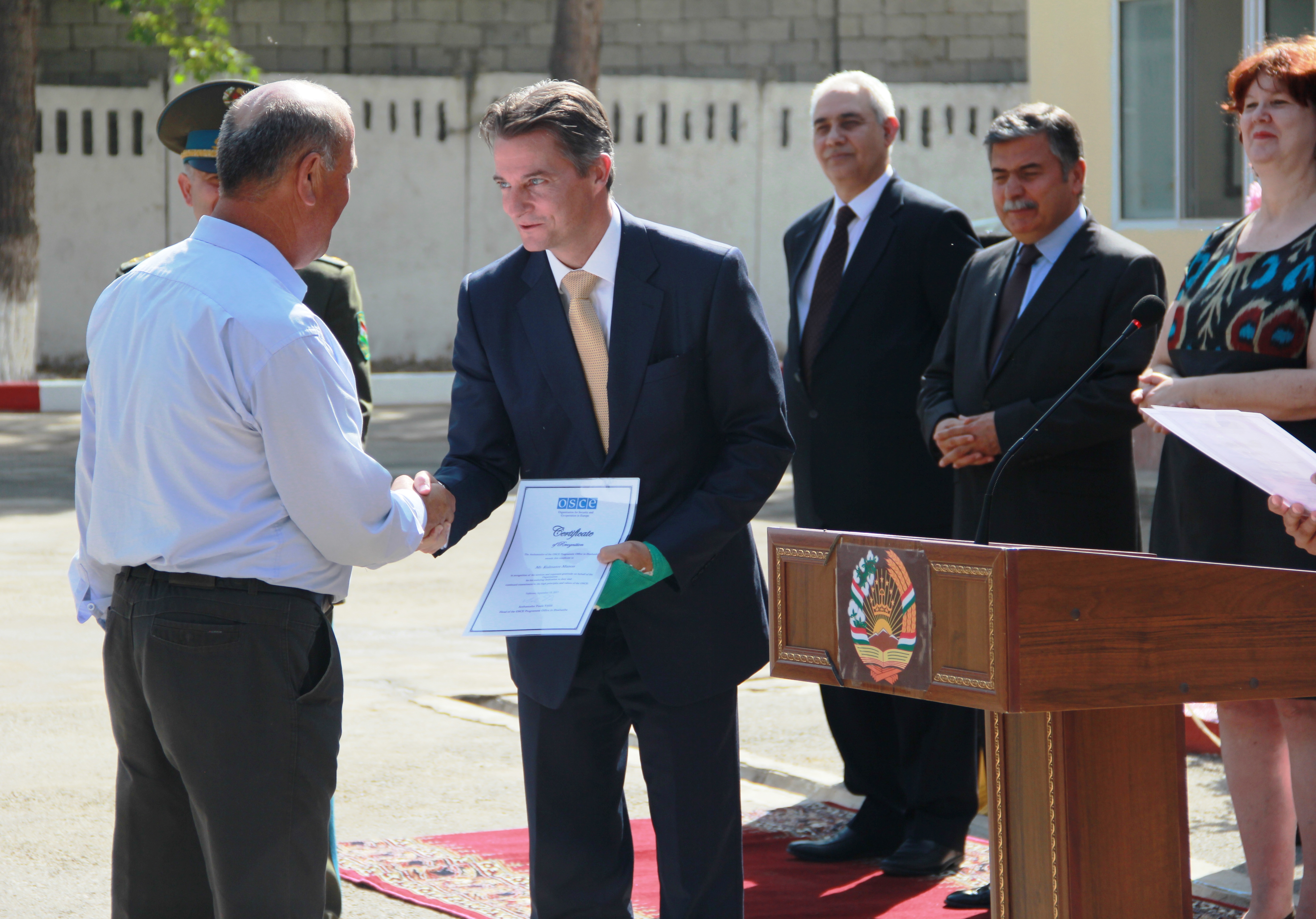 Chargé d’Affaires Kevin Covert of the US Embassy in Tajikistan hands over a certificate of recognition, Gissar Training Centre, 15 September 2017.