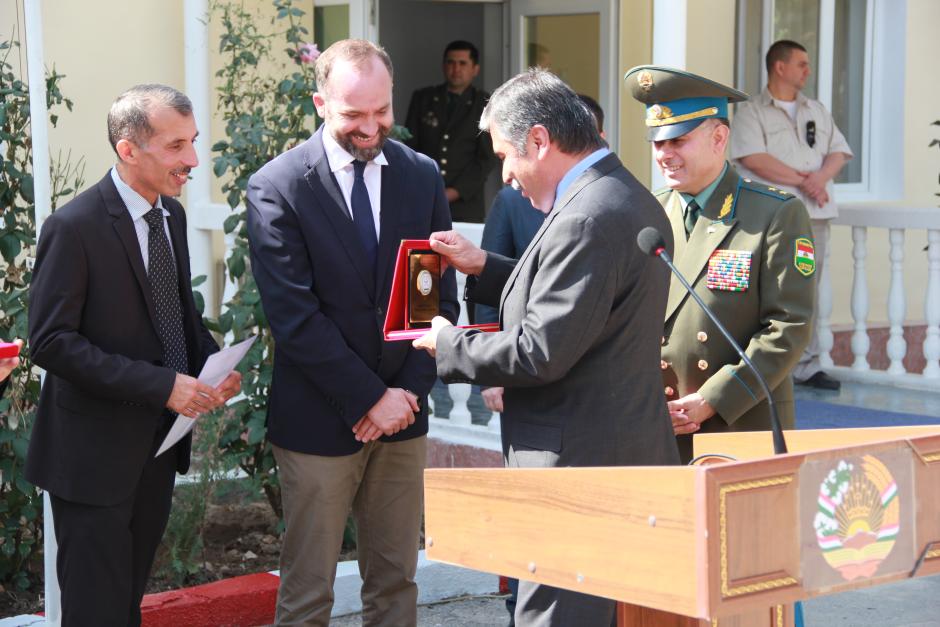 Afghan Attaché Said Osef Akram presenting a gift to Fejzo Numanaj (c), Head of the OSCE Programme Office’s Politico-Military Department in Dushanbe, Gissar Training Centre, 15 September 2017.
