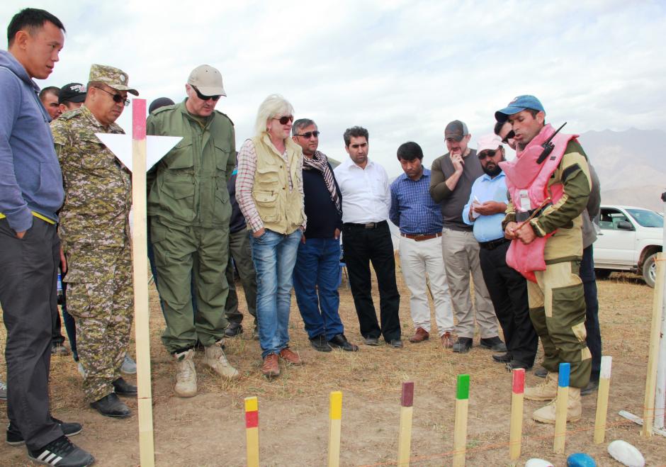 Swiss Foundation for Mine Action team leader (r) briefing the participants on battle area clearance procedures, Chorcharogh, Gharm, 27 September 2017.