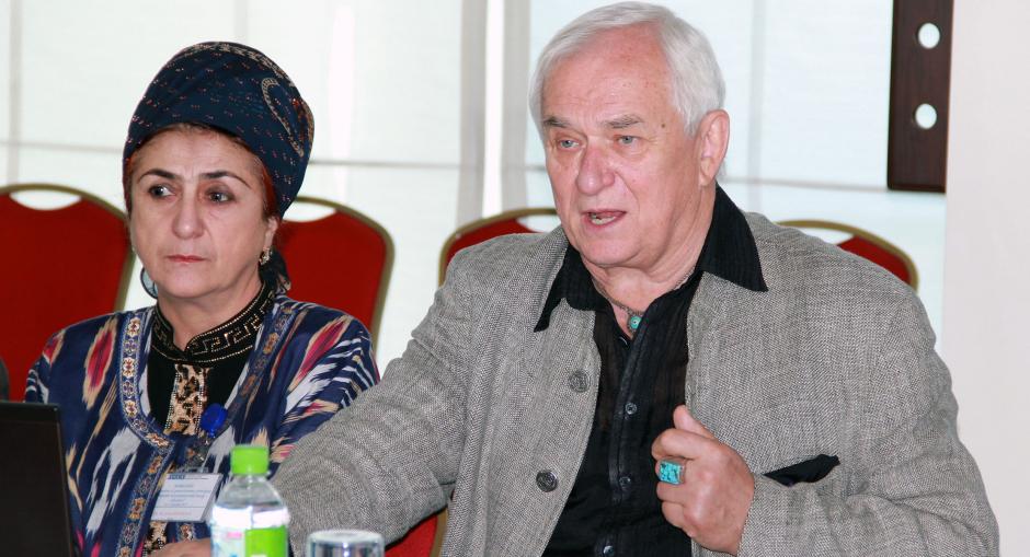 Saulius Smalys, International Consultant on green economy (r) and Savriniso Hafizova, Manager of Aarhus Centre in Garm (l) during workshop on promotion of green economy principles, Dushanbe, 9 October 2017.