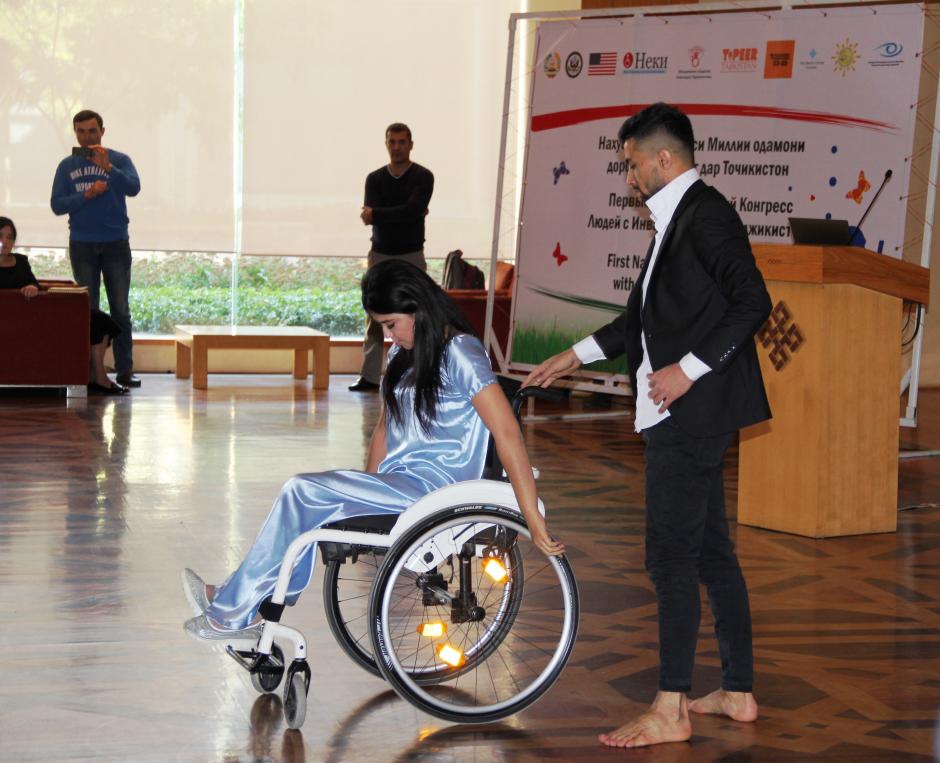 Participant of the first National Congress of People with Disabilities performing a wheelchair dance with her dance partner, Dushanbe, Tajikistan.