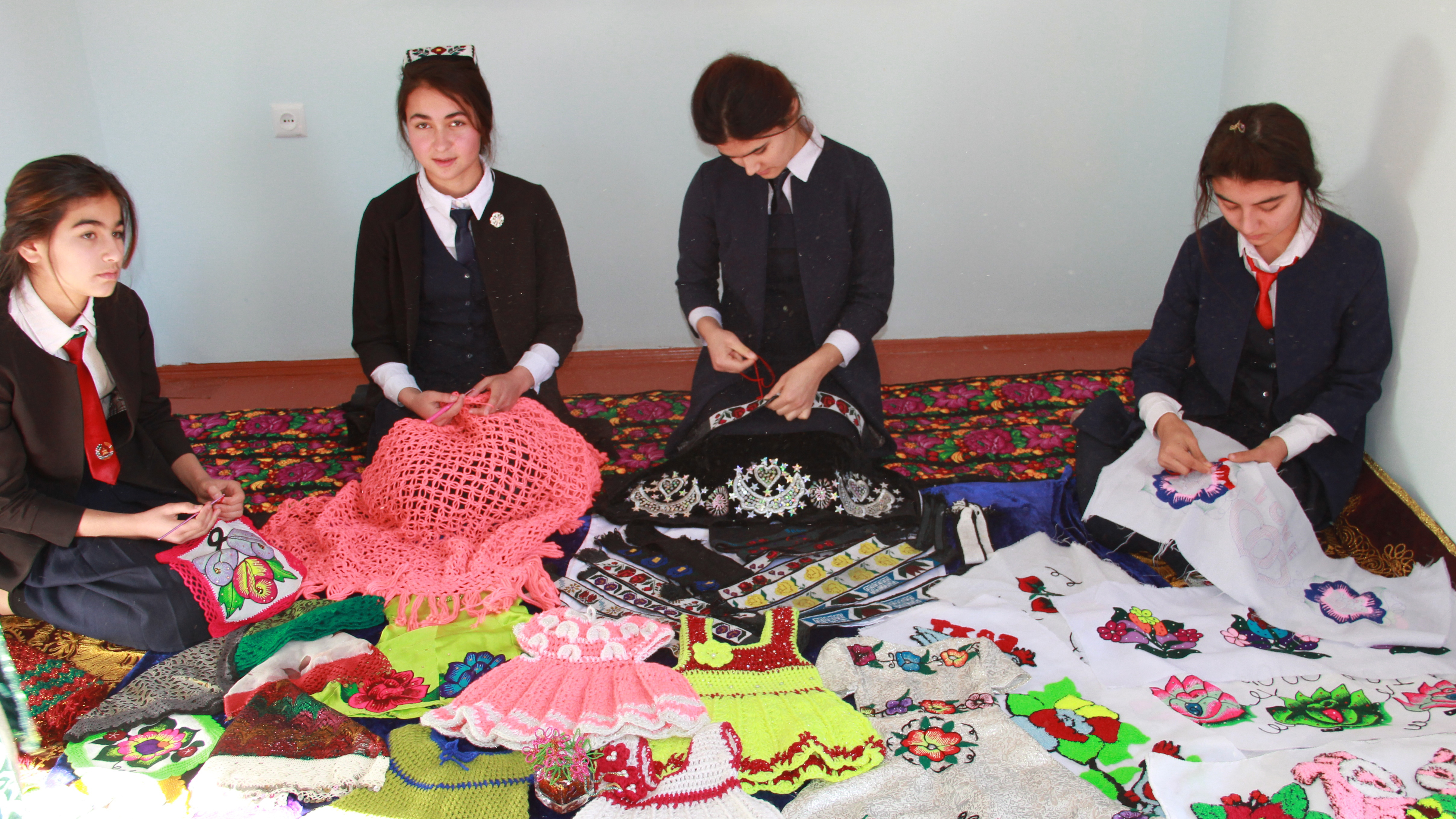 Schoolgirls engaged in embroidery in the newly refurbished vocational training classroom, Nurek city, 22 November 2017.