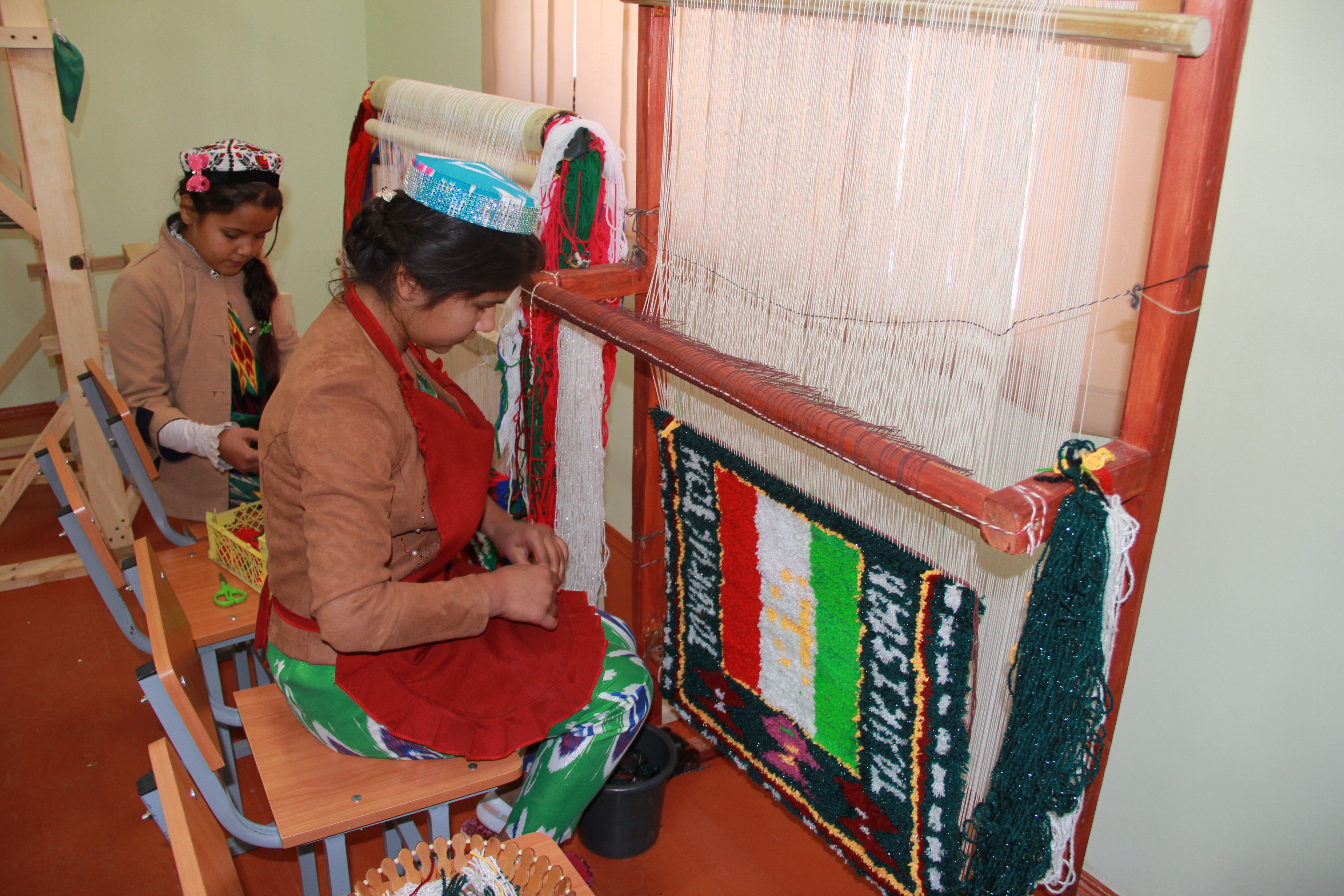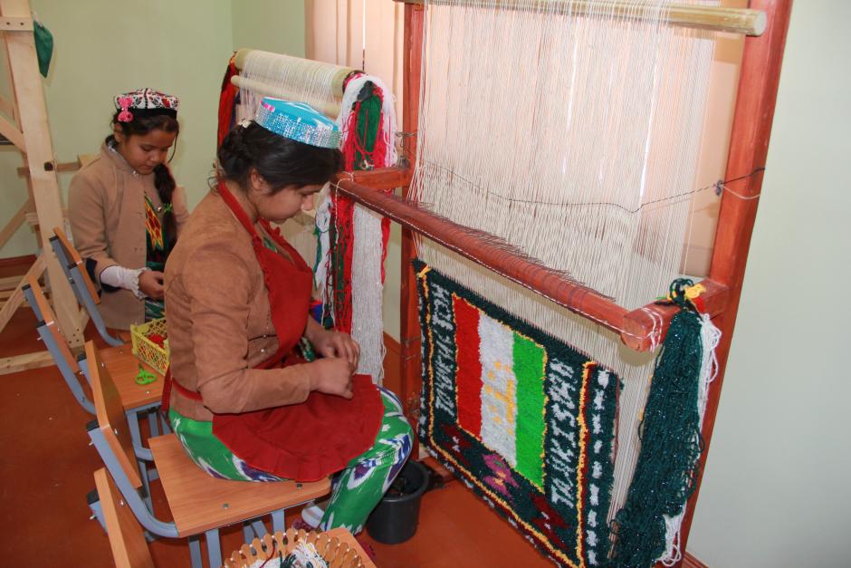 Schoolgirls learning the skill of carpet weaving in the newly refurbished vocational training classroom, Nurek city, 22 November 2017.