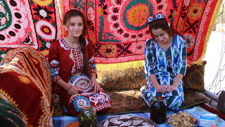 Schoolgirls in traditional Tajik attire during the school fare trade, Nurek city, 22 November 2017.