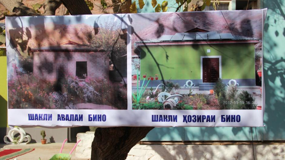A signboard at the left side displaying the previous condition of a building and at the right side the current refurbished building of a vocational training classroom of school #11, Nurek city, 22 November 2017.