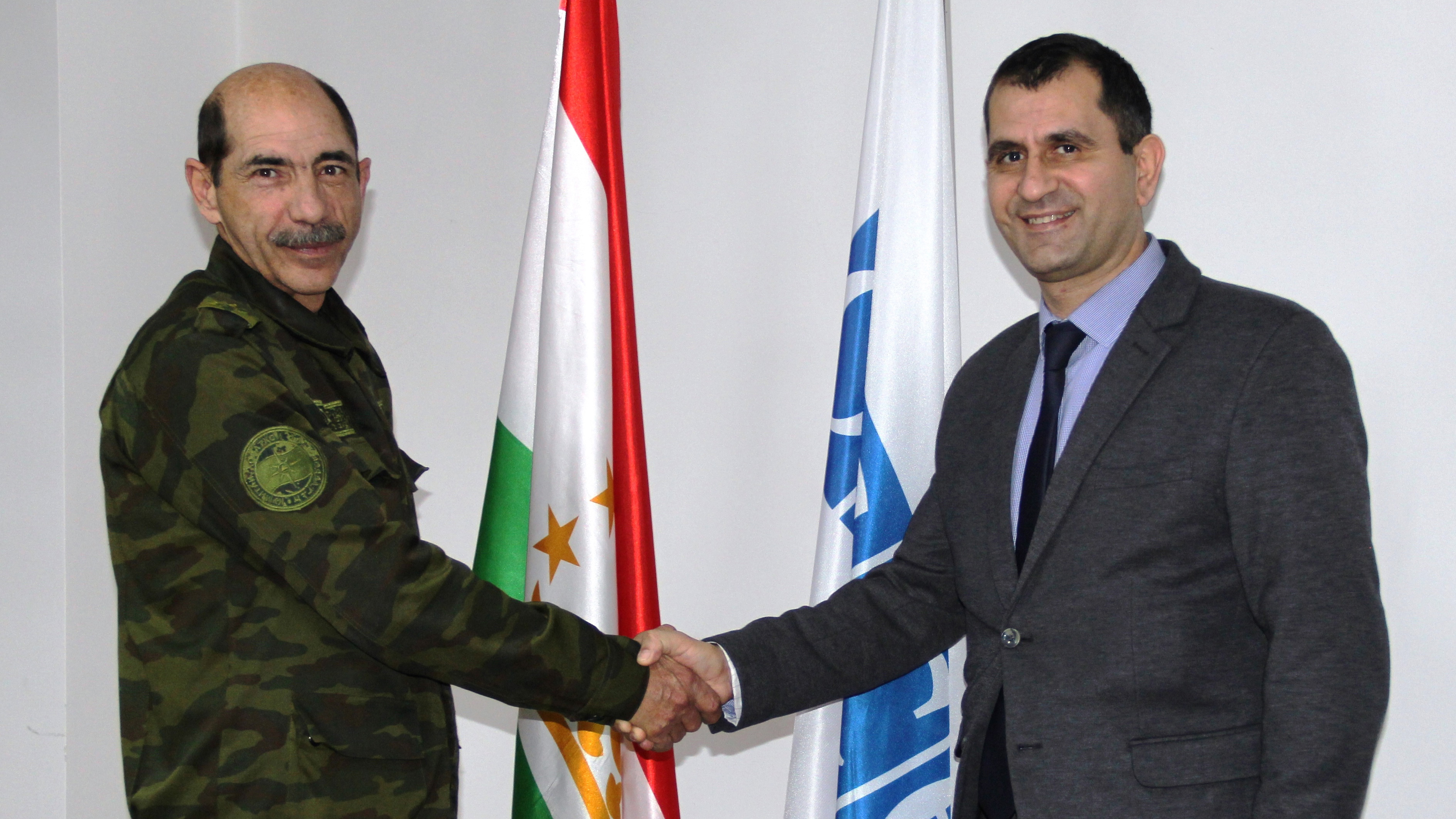 Zarif Saidov(l), Head of the Department for training of rescue workers and Edward Safaryan, Acting Head of the Economic and Environmental Department at the OSCE Programme Office in Dushanbe during a donation ceremony, Dushanbe, 19 December 2017.