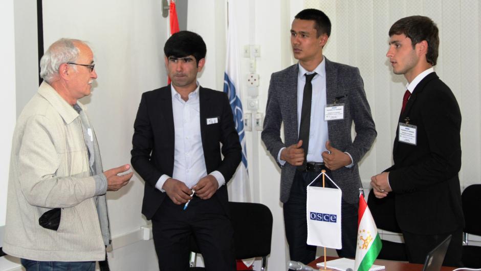 Ahmadsho Komilzoda (l), Deputy Head of the Democratic Party of Tajikistan, speaking to young gender champions, Dushanbe, 28 March 2018.