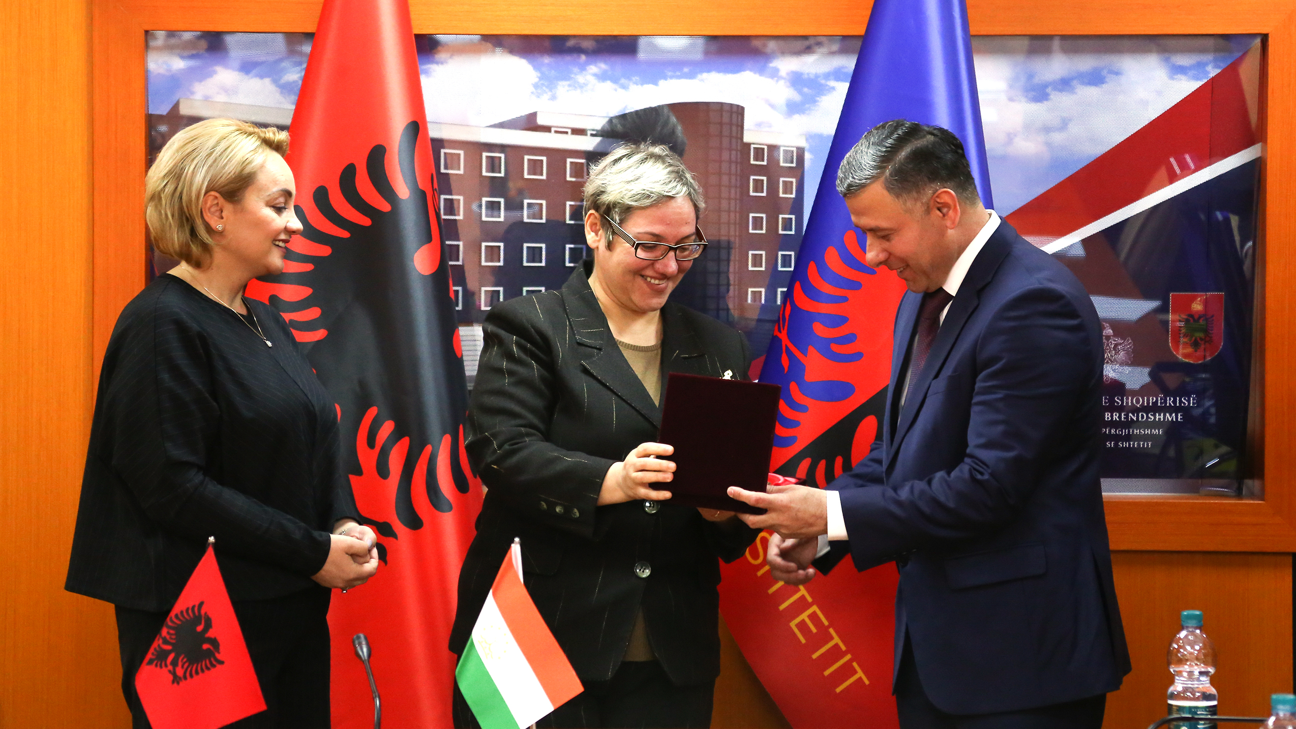 Colonel-General Rajabali Rahmonali presenting Tajik souvenirs to representatives of the Albanian State Police, Tirana, 26 March 2018.