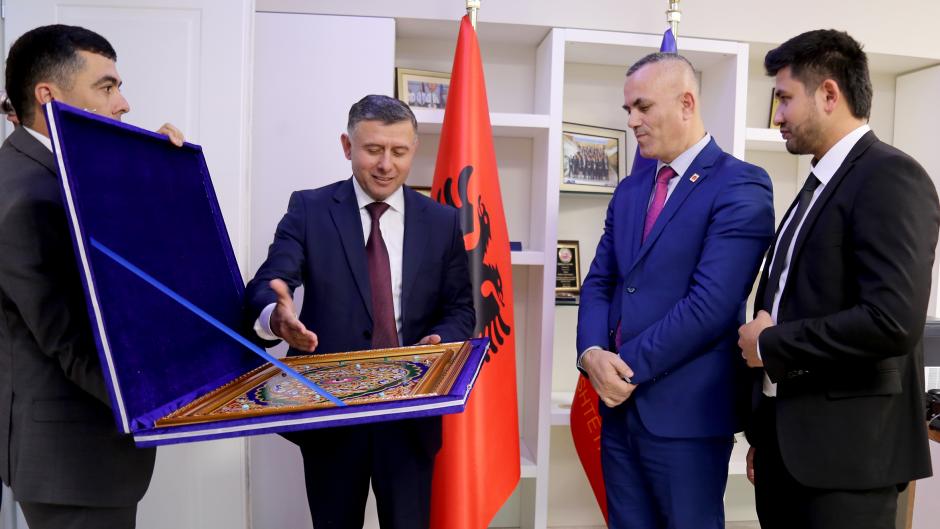 Colonel-General Rajabali Rahmonali presenting a national souvenir to Ardi Veliu, the General Director of the Albanian State Police, Tirana, 26 March 2018.