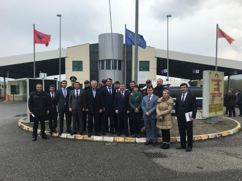 Representatives of the Tajik Delegation, Albanian State Police and Montenegro Border Police pose for a group photo at the Shkoder/Muriqan shared border crossing point, Tirana, 27 March 2018.