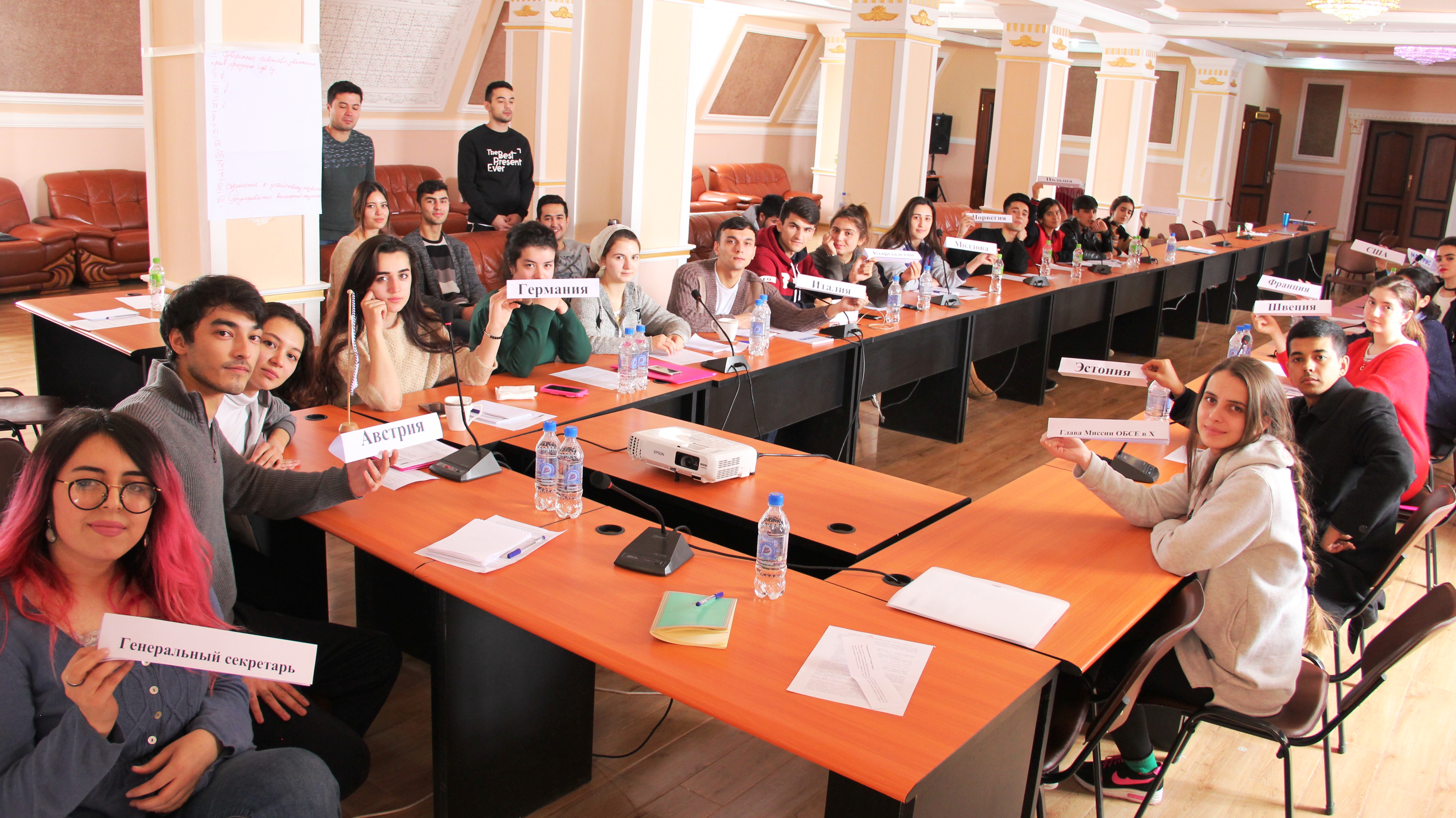 Participants of the OSCE Youth Winter School during an exercise simulating a meeting of the OSCE Permanent Council, Khoja Obigarm, 3 February 2018.