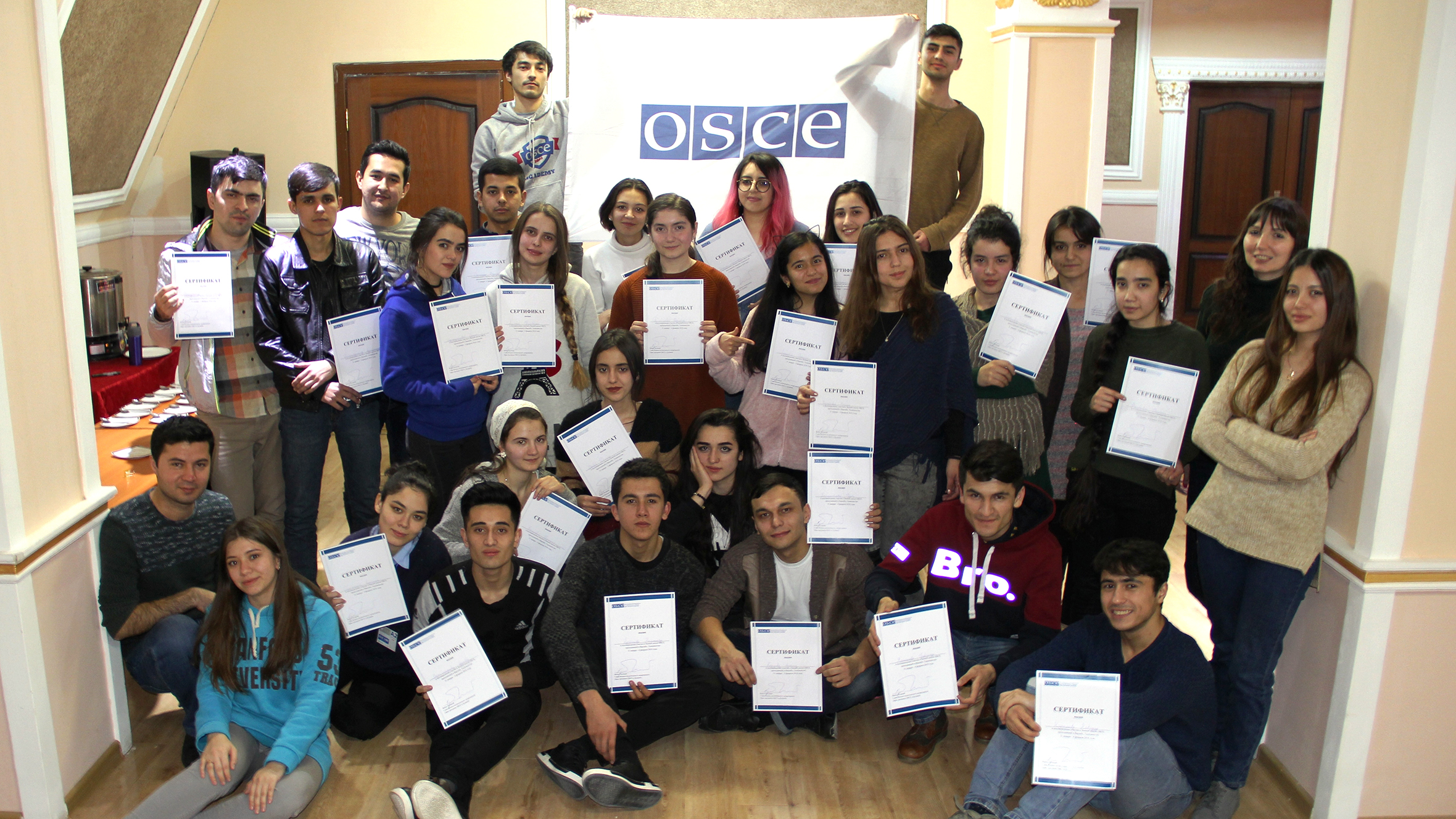 Participants of the OSCE Youth Winter School display their certificates of attendance, Khoja Obigarm, 3 February 2018.