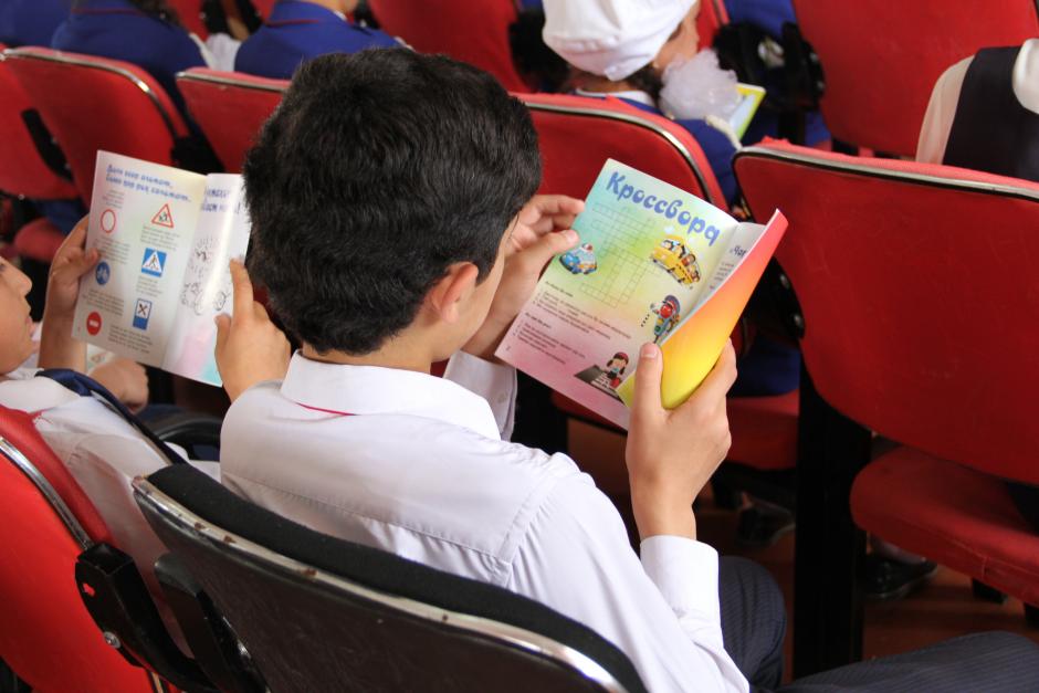 Students of Gymnasium No.74 holding booklets on road safety rules for schoolchildren, Dushanbe, 10 May 2018.