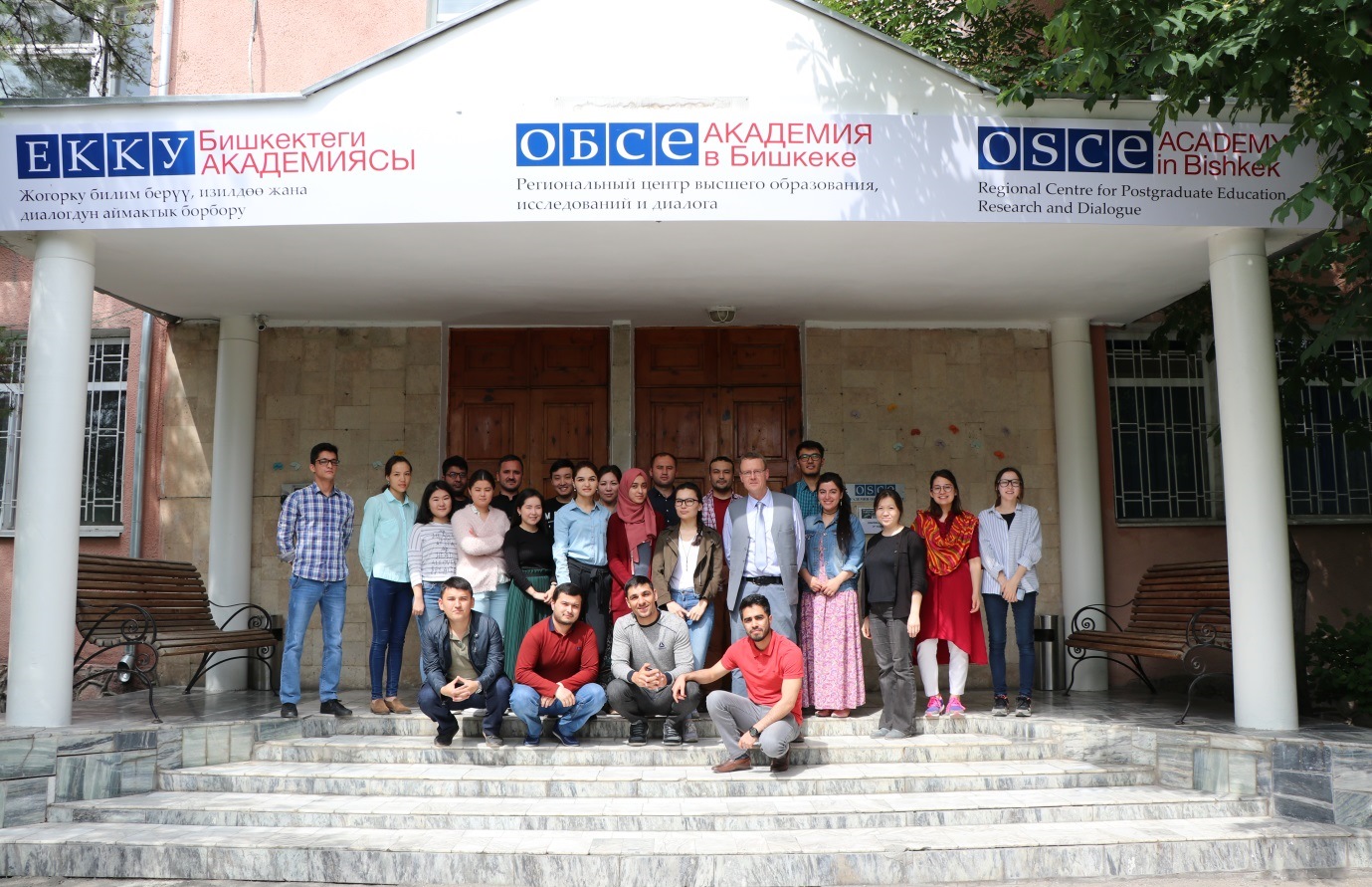 Kai Wegerich (centre-right), Water and Energy Policy Adviser at the OSCE Programme Office in Dushanbe, and students of the Master’s programme in Economic Governance and Development at the OSCE Academy in Bishkek pose for a group photo, Bishkek, 23 May 2018.