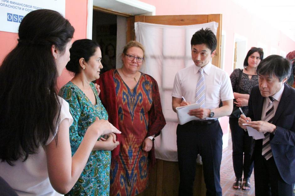 The Japanese delegation, accompanied by H.E. Hajime Kitaoka (r), Ambassador of Japan to the Republic of Tajikistan and Ambassador Tuula Yrjölä (c), Head of the OSCE Programme Office visiting the OSCE-supported Women’s Resource Centre (WRC) in Khuroson, Khatlon region, 7 June 2018.