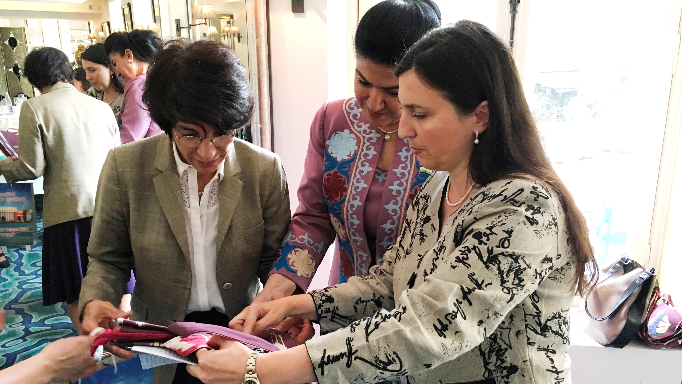 Khairiniso Yusufi (c), Vice Speaker of the Tajik Parliament, and Vesna Ivanovikj-Castarede (r), Gender and Anti-Trafficking Officer at the OSCE Programme Office in Dushanbe, presenting Tajik handicrafts to Florence Mangin, Director for Continental Europe, Senior Officer for equal rights between women and men at the Ministry for Europe and Foreign Affairs, Paris, 12 June 2018.