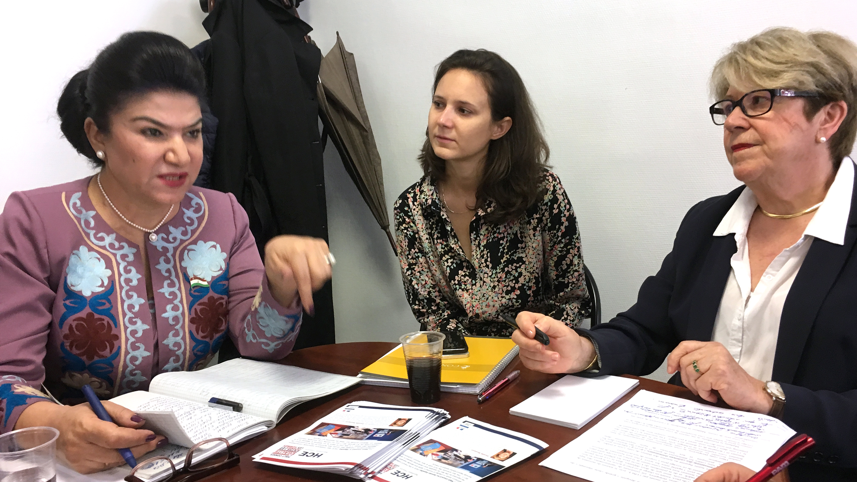 Khairiniso Yusufi (l), Vice Speaker of the Tajik Parliament, and Danielle Bousquet (r), the President of the High Council for Equality between Women and Men, during the discussion on how to tackle domestic violence and violence against women, Paris, 12 June 2018.