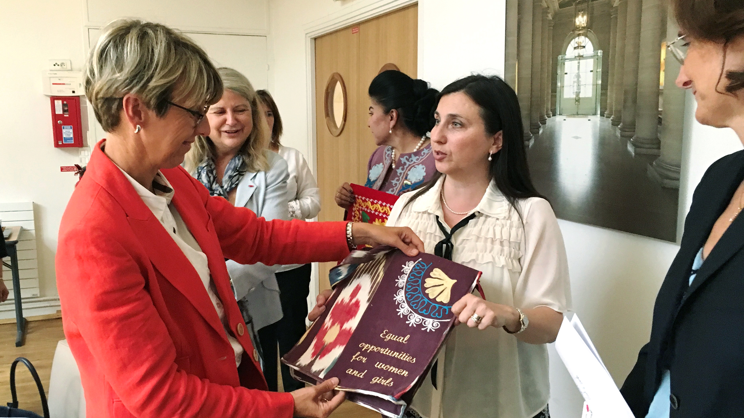 Vesna Ivanovikj-Castarede (c), Gender and Anti-Trafficking Officer at the OSCE Programme Office in Dushanbe, presenting a handbag with a message “equal opportunities for women and girls” to the Senator Annick Billon (l), the President of the delegation of women in the French Senate, Paris, 14 June 2018.