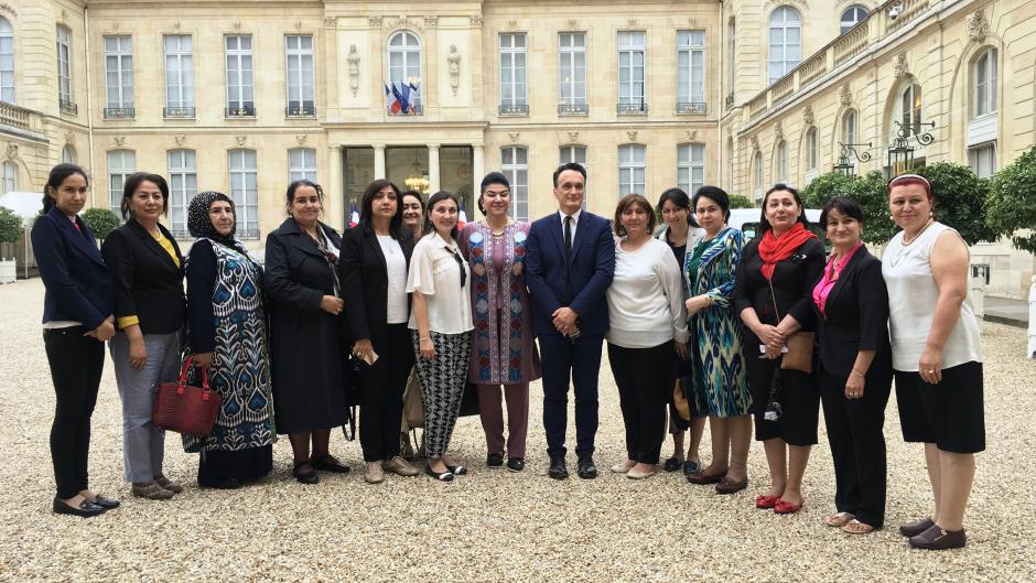 Tajik delegation and Jean-Marc Berthon (centre), Advisor for development Policies, Human Rights and Civil society, at the Élysée Palace, Paris, 14 June 2018.