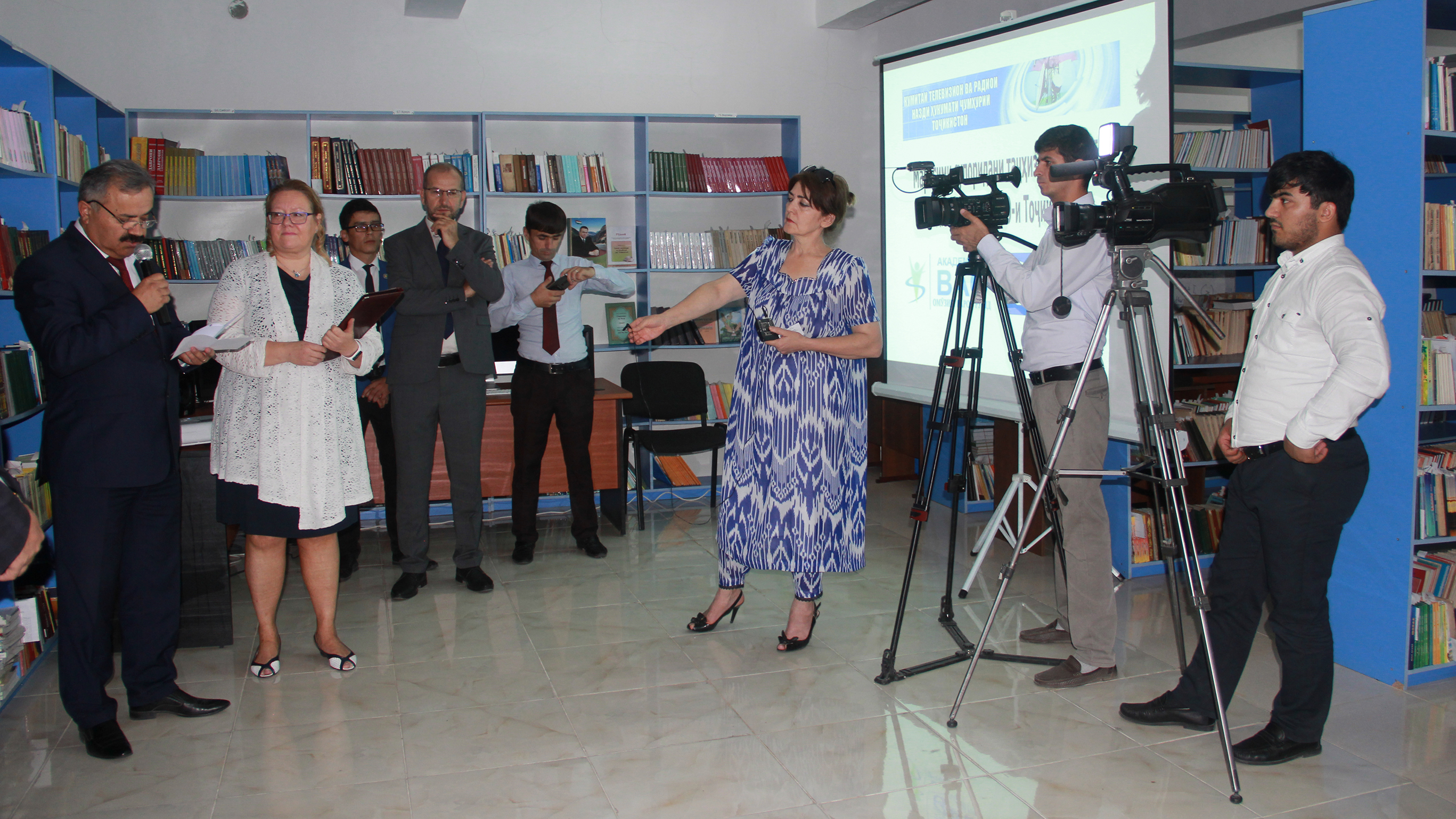 Left to right: Mahmadsharif Bobshohzoda, Deputy Head of the Tajik State television and radio committee, Ambassador Tuula Yrjölä, Head of the OSCE Programme Office in Dushanbe, Farrukhsho Dzhunaydov, National Media Development Officer of the OSCE Programme Office in Dushanbe at the handover ceremony of technical equipment to the Media Academy, Dushanbe, 15 September 2018.