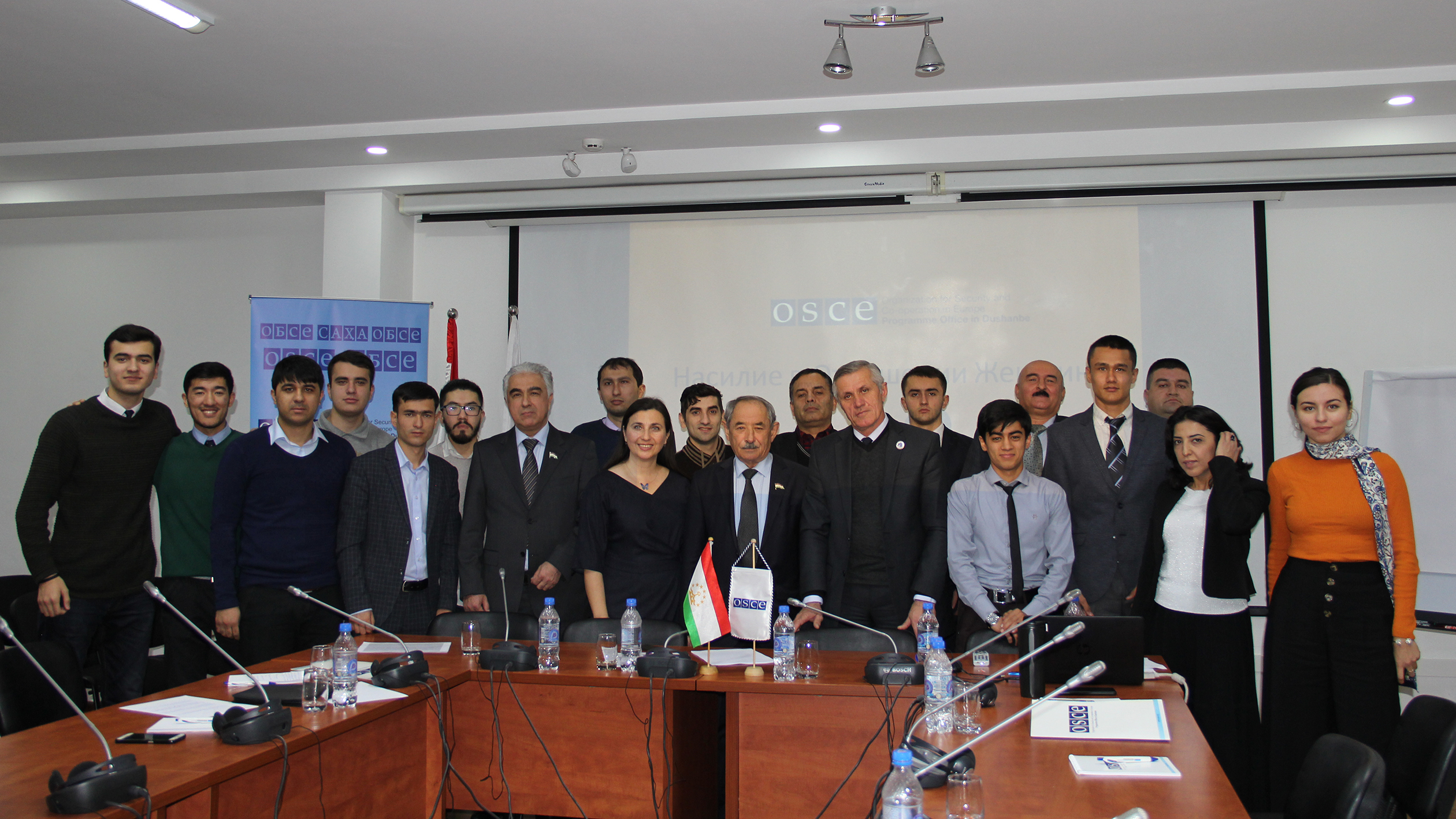 Vesna Ivanovikj-Castarede (centre), the Gender and Anti-Trafficking Officer of the OSCE Programme Office in Dushanbe, Saidjafar Usmonzoda (centre-left), member of Tajik Parliament and Head of Democratic Party of Tajikistan, members of Tajikistan’s parliament and Tajik Men Engage Network, politicians, young gender champions and civil society representatives during a one-day train-the-trainers course “No excuses”, Dushanbe, 27 November 2018.