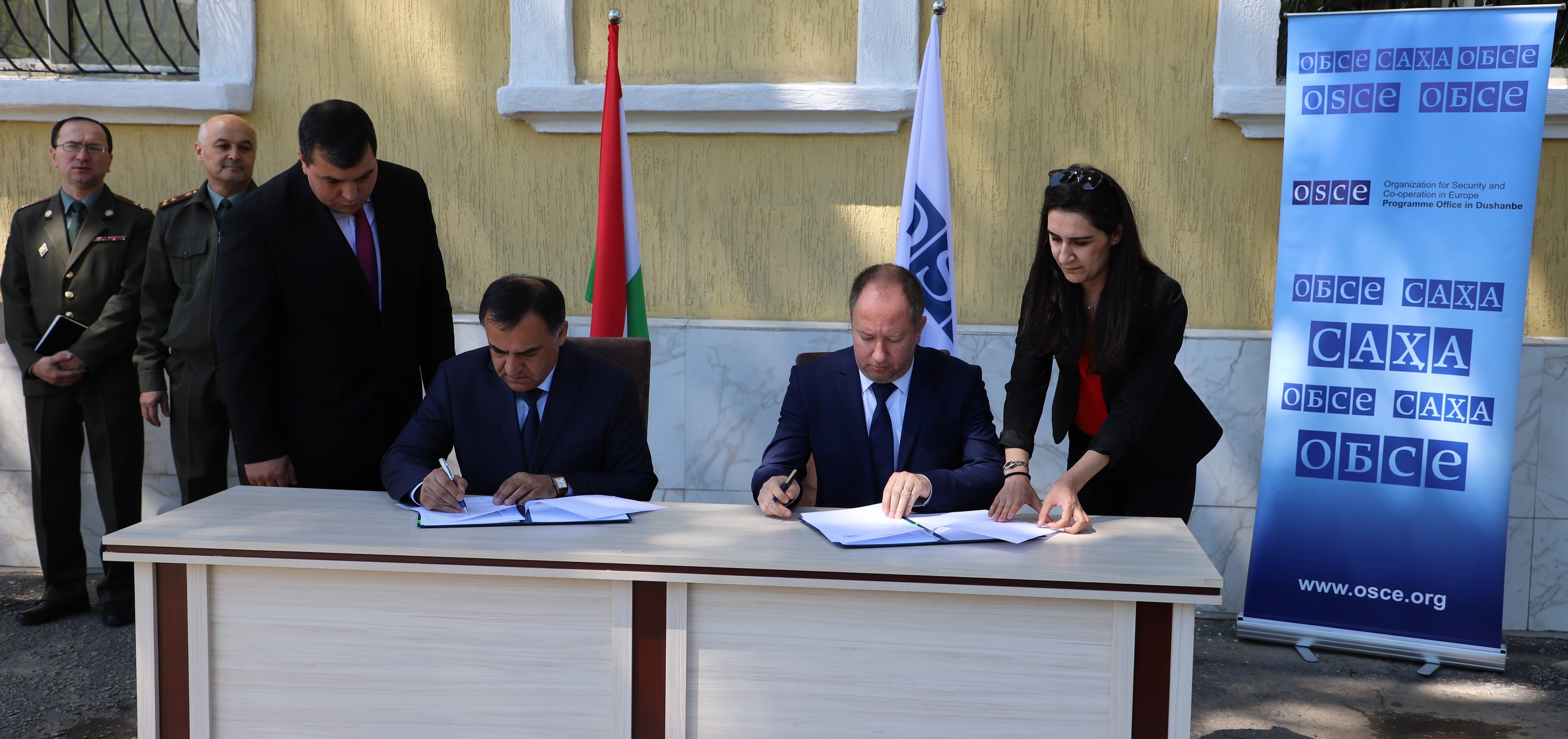 Rustam Nazarzoda (l), Head of the Committee of Emergency Situation and Civil Defense, and Filippo Crivellaro (r), Head of the Economic and Environmental Department at the OSCE Programme Office in Dushanbe during a handover ceremony, Dushanbe, 12 April 2019.