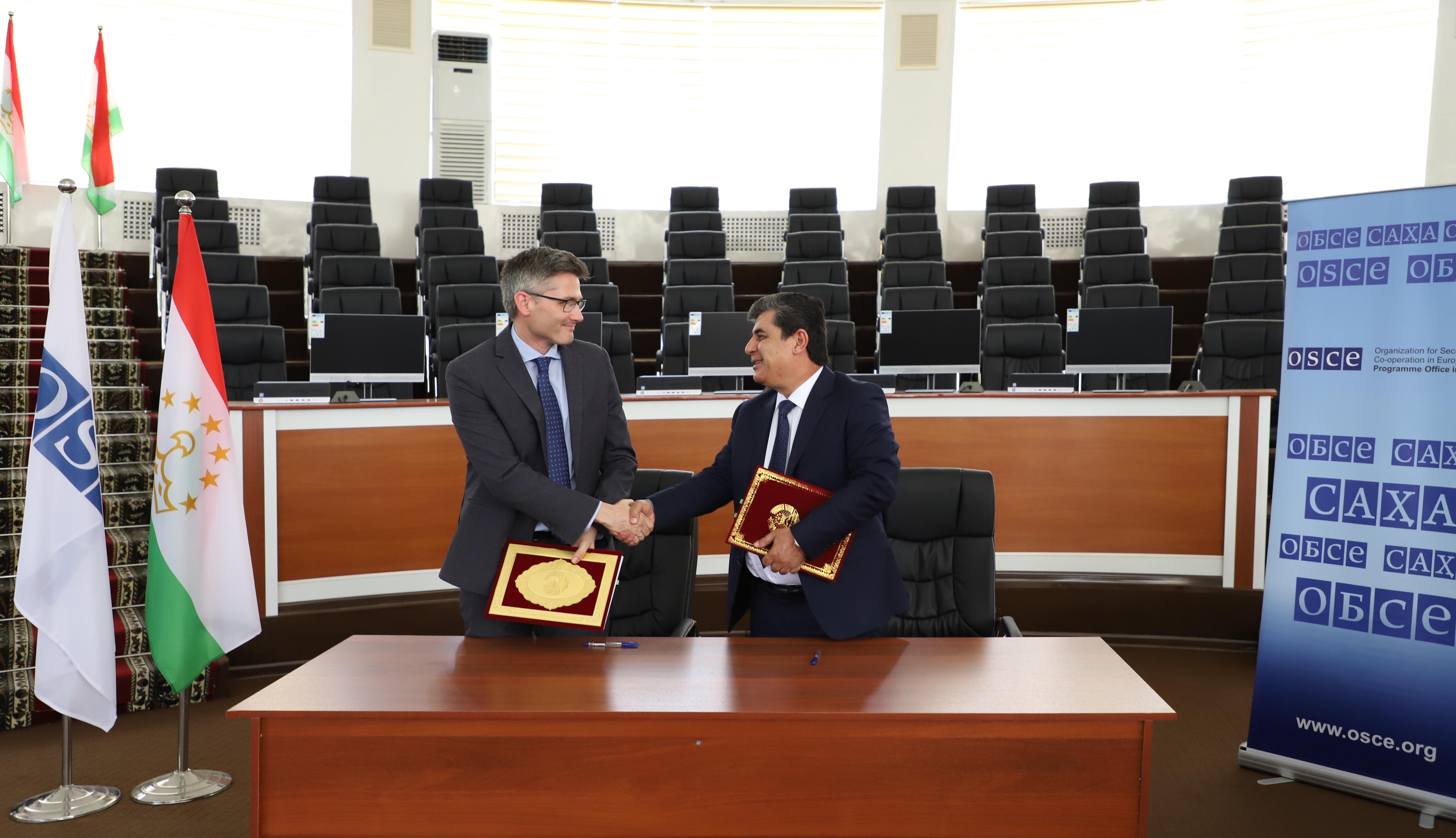 Robert Heuer (l), Head of the Human Dimension Department at the OSCE Programme Office in Dushanbe and Soleh Zavkizoda (r), Director of the Judicial Training Centre at the handover ceremony of office equipment, Dushanbe, 19 April 2019.