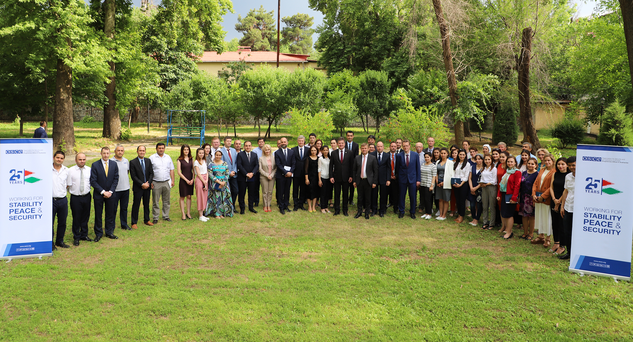 The OSCE Programme Office in Dushanbe staff members and the OSCE Chairperson-in-Office Lajčák pose for a group photo, Dushanbe, 22 May 2019.