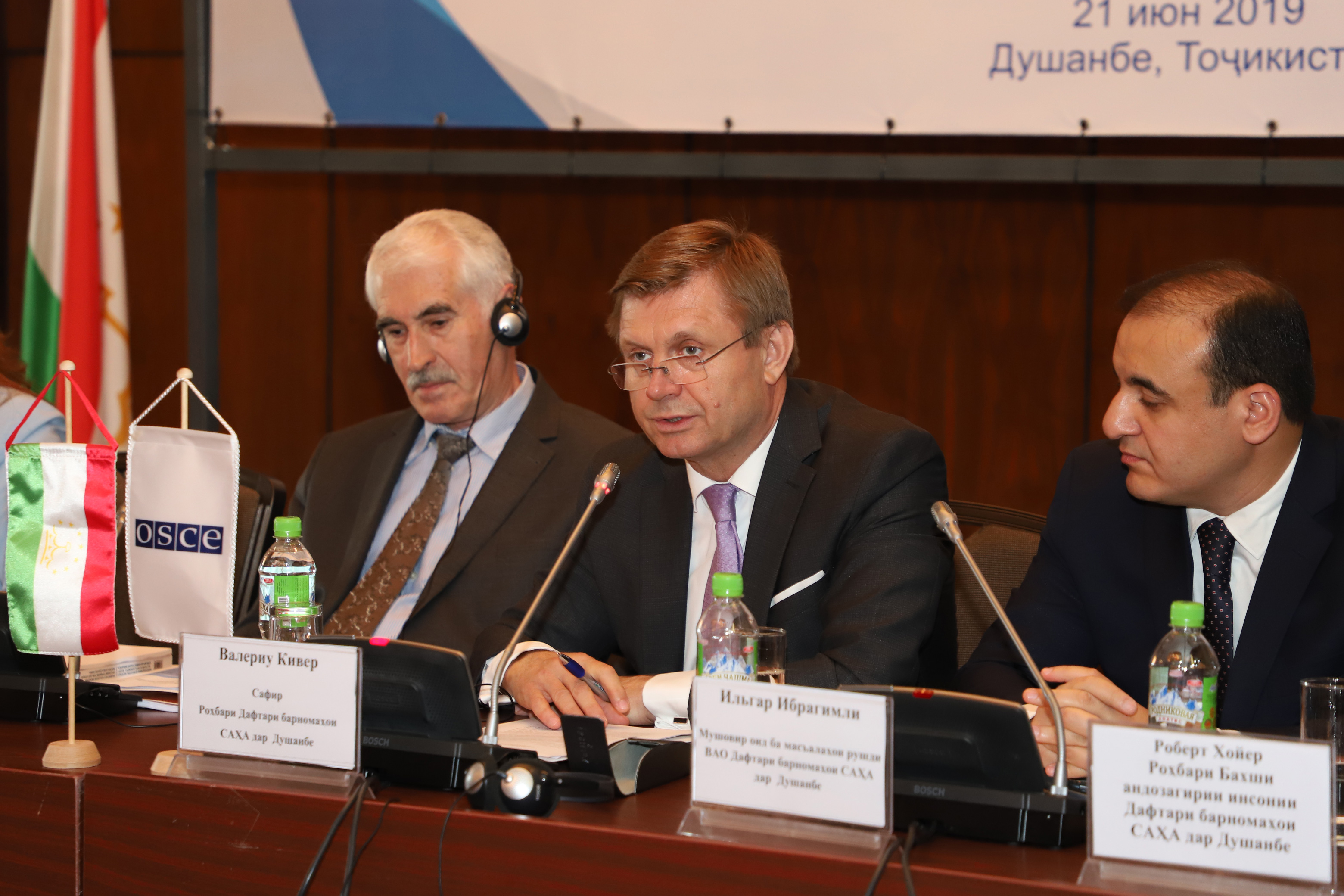 Ambassador Valeriu Chiveri (c), Head of the OSCE Programme Office in Dushanbe, addressing the participants of the roundtable discussion on media self-regulation in Tajikistan, Dushanbe, 21 June 2019.