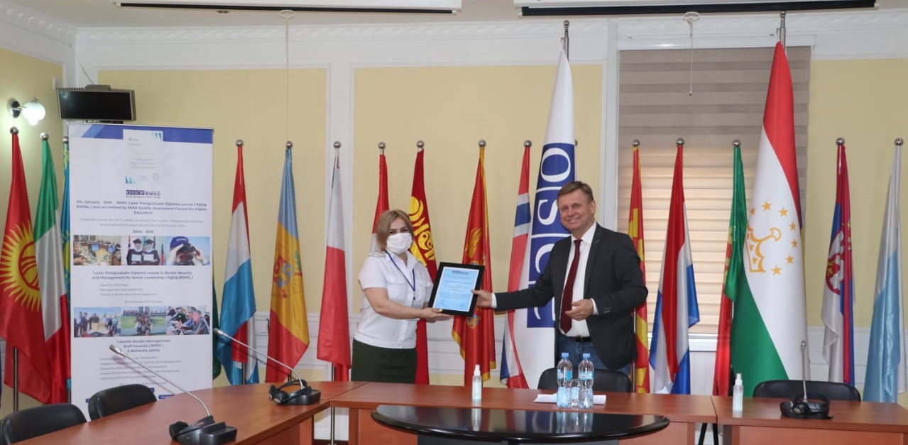 Valeriu Chiveri (r), Head of the OSCE Programme Office in Dushanbe and Zaragul Shabunova (l), participant of the 29th Staff Course for Women Leaders during the course graduation ceremony, Dushanbe, 19 July 2021.