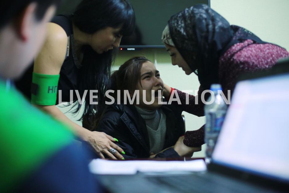 Actors simulating cases of human trafficking for labour and sexual exploitation during a four-day national simulation-based training on combating trafficking in persons, Safed-Dara, Tajikistan, 28 October 2021.