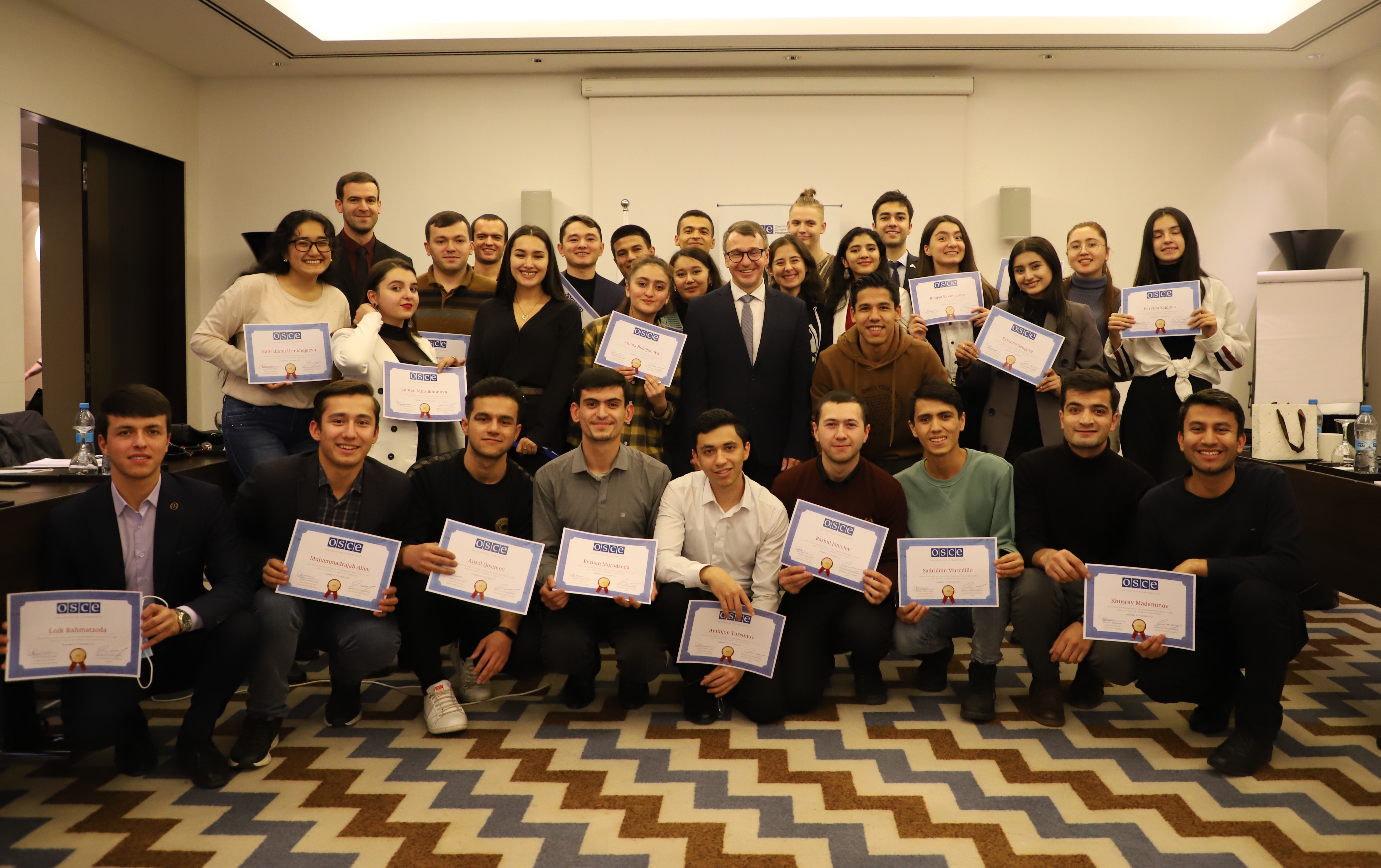 Workshop participants on role of youth in combating corruption in Tajikistan pose for a group photo, Dushanbe, 17 November 2021.