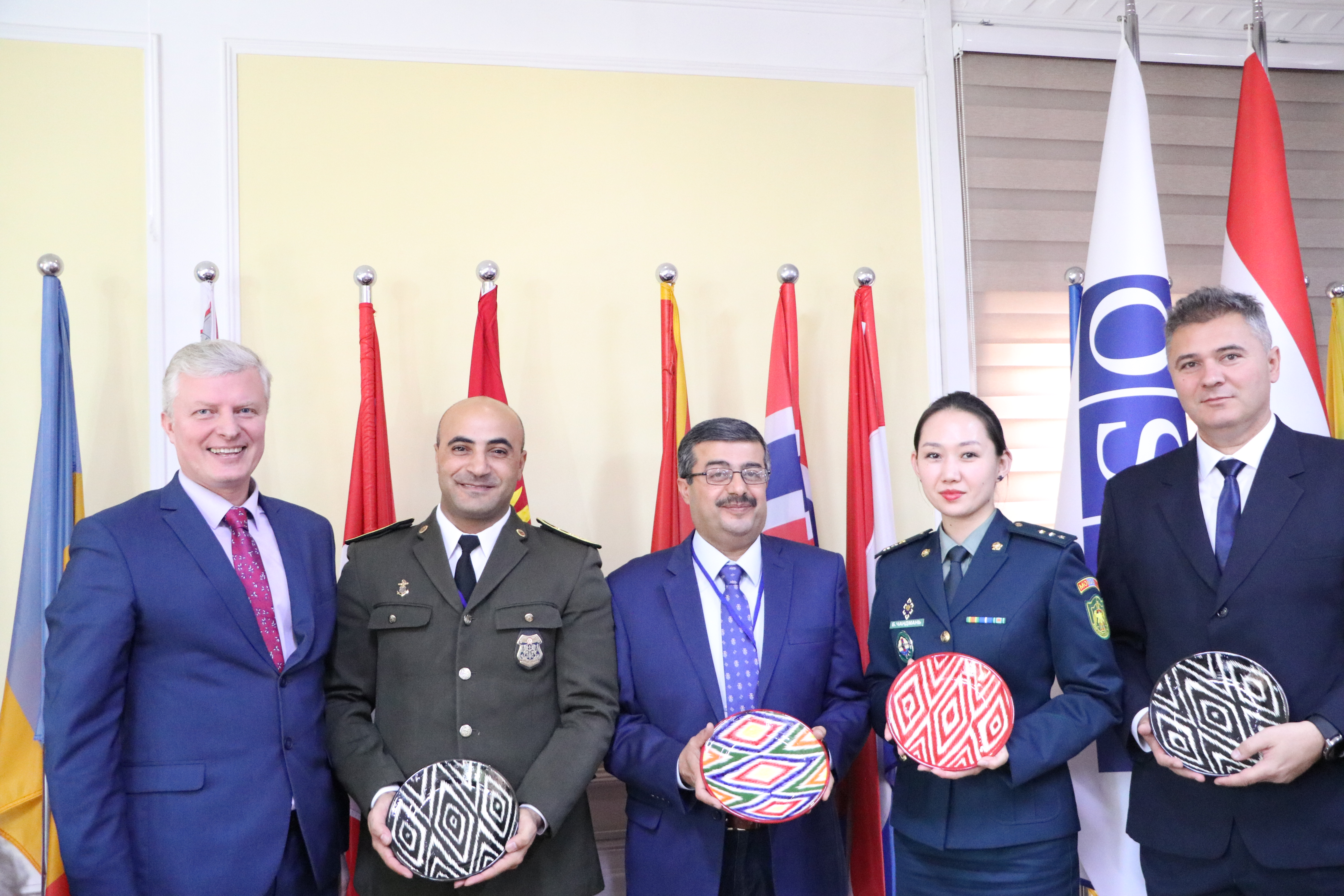 Ihar Kuzminich (l), OSCE BMSC Acting Director, Riadh Salhi from Tunisia, Amjad Sulaiman Maddan Al Khaldi from Jordan, Chandmani Bold from Mongolia and Igor Zdravkovski from North Macedonia during the course graduation ceremony, Dushanbe, 10 December 2021.