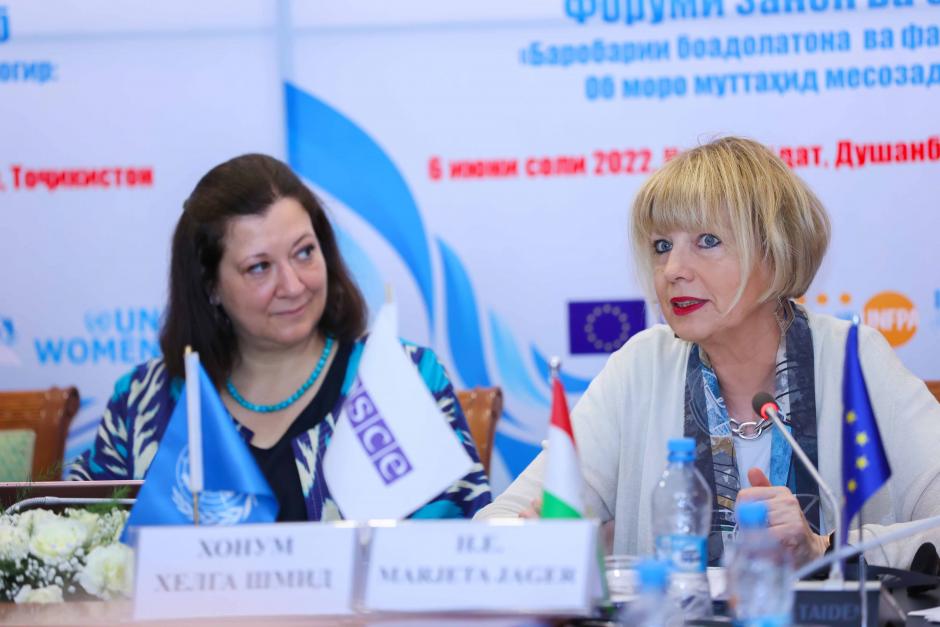OSCE Secretary General Helga Maria Schmid (right) delivering an opening statement at the pre-conference forum “Women Water Forum: Equity, Diversity and Inclusion – Water Unites Us”, Dushanbe, 6 June 2022.