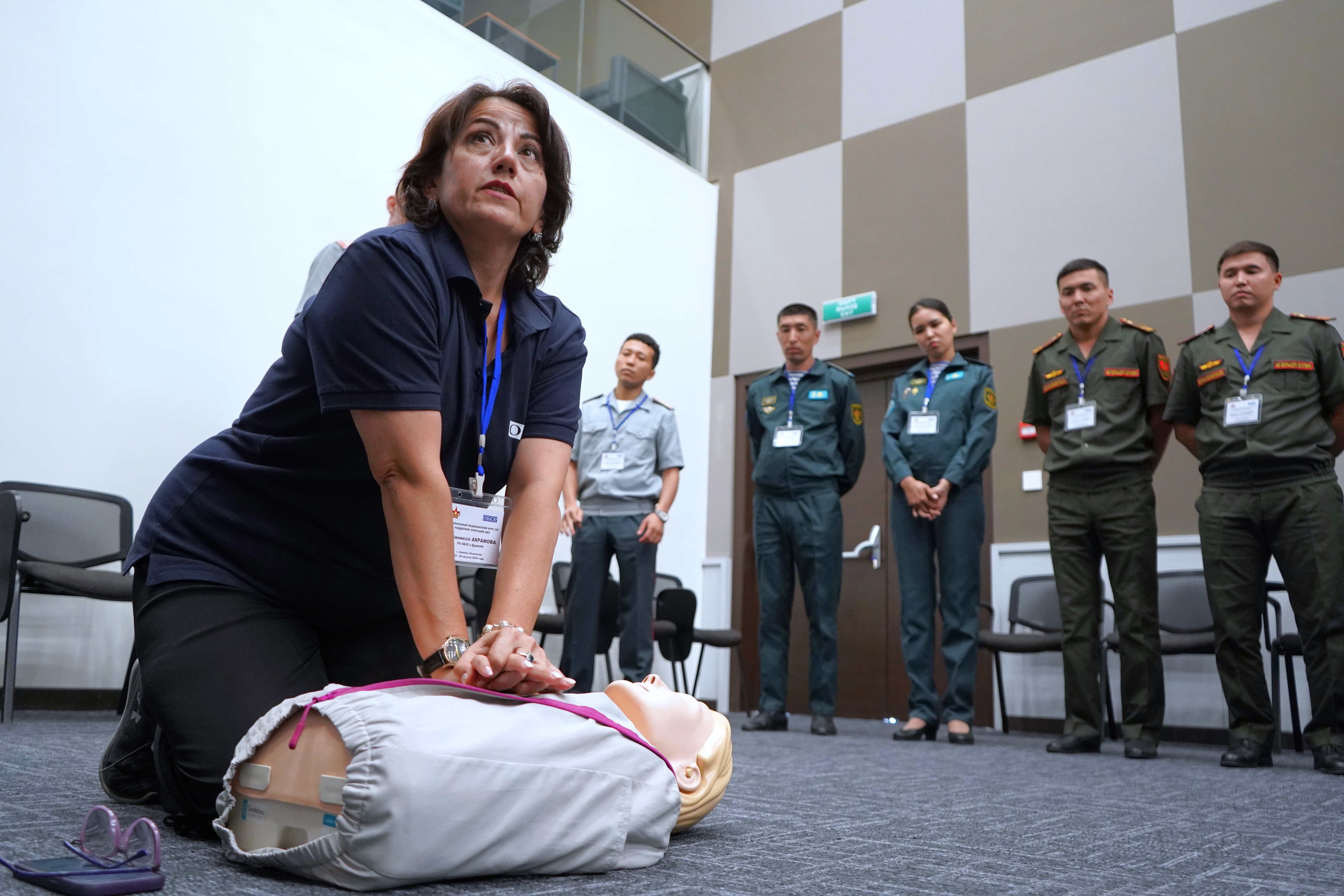 Medical specialists from Kazakhstan, Kyrgyzstan, Tajikistan, Turkmenistan, and Uzbekistan attending a nine-day regional medical training course organized by the OSCE Programme Office in Dushanbe, in partnership with the OSCE Programme Office in Astana and the Kazakh Ministry of Defense’s Center for Arms Control and Inspection Support, Almaty, Kazakhstan, 19 August 2024.