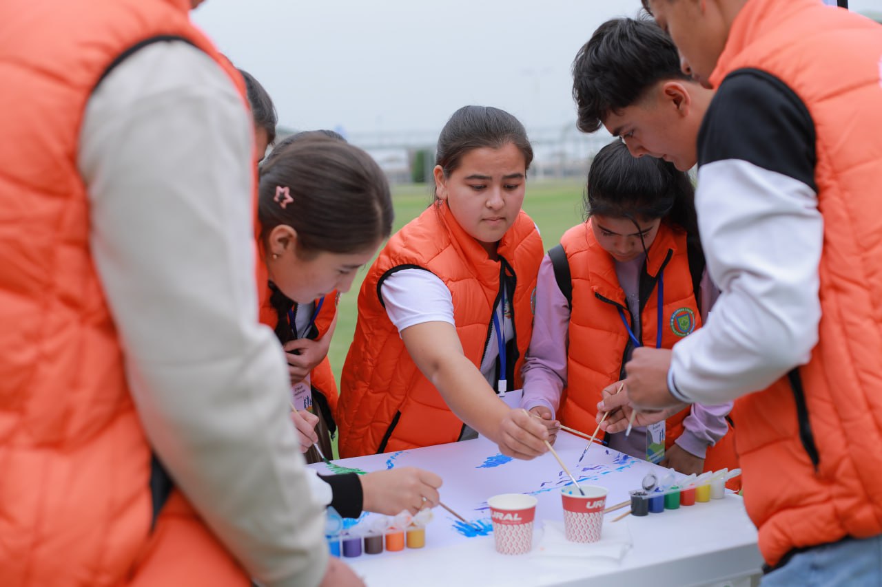 Participants from Tajikistan and Uzbekistan engaged in team-building activities at the Second International Youth Forum of the Syrdarya River Basin in Khujand, 30 September 2024.